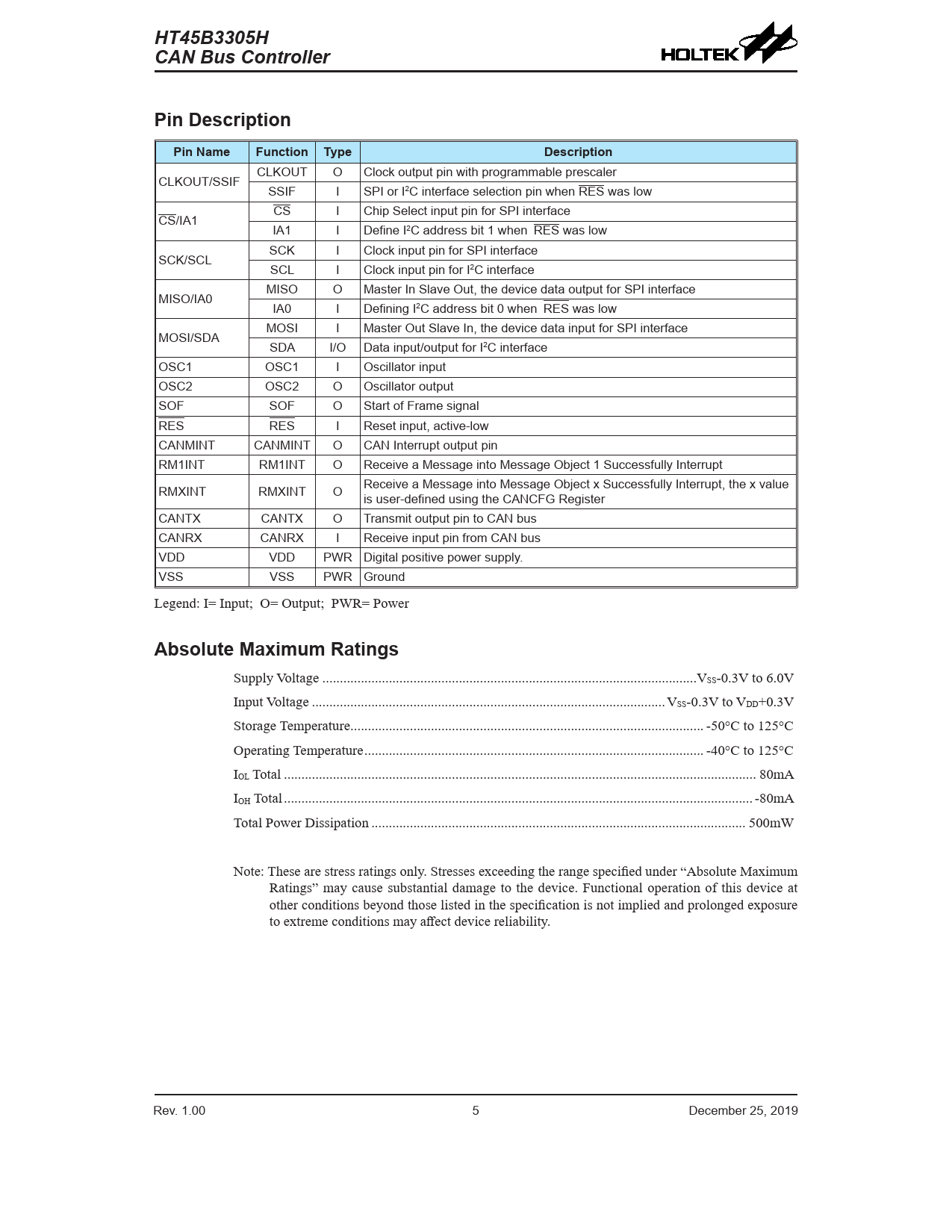 HT45B3305H CAN Bus Controller Pin Description Pin Name Function Type Description Absolute Maximum Ratings