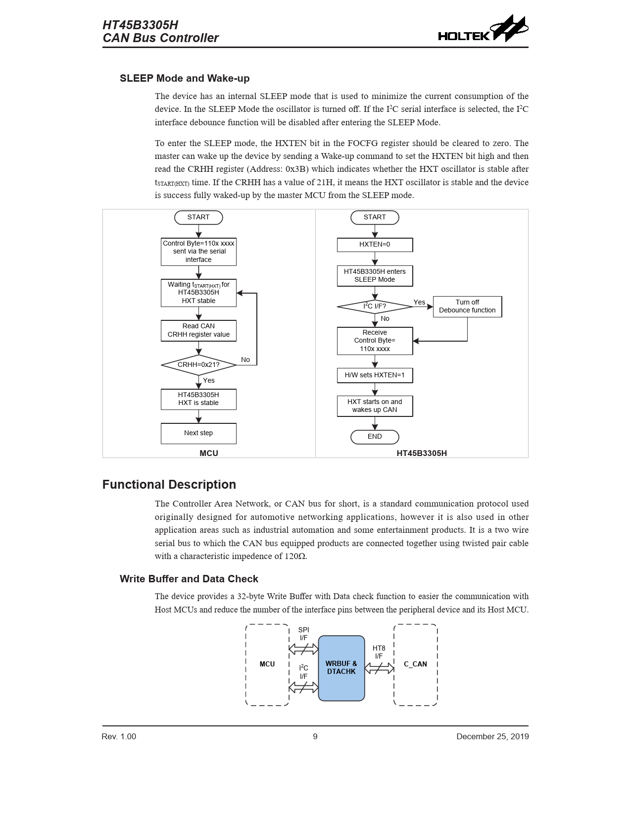 HT45B3305H. CAN Bus Controller. SLEEP Mode and Wake-up. MCU. Functional Description. Write Buffer and Data Check. WRBUF &. C_CAN