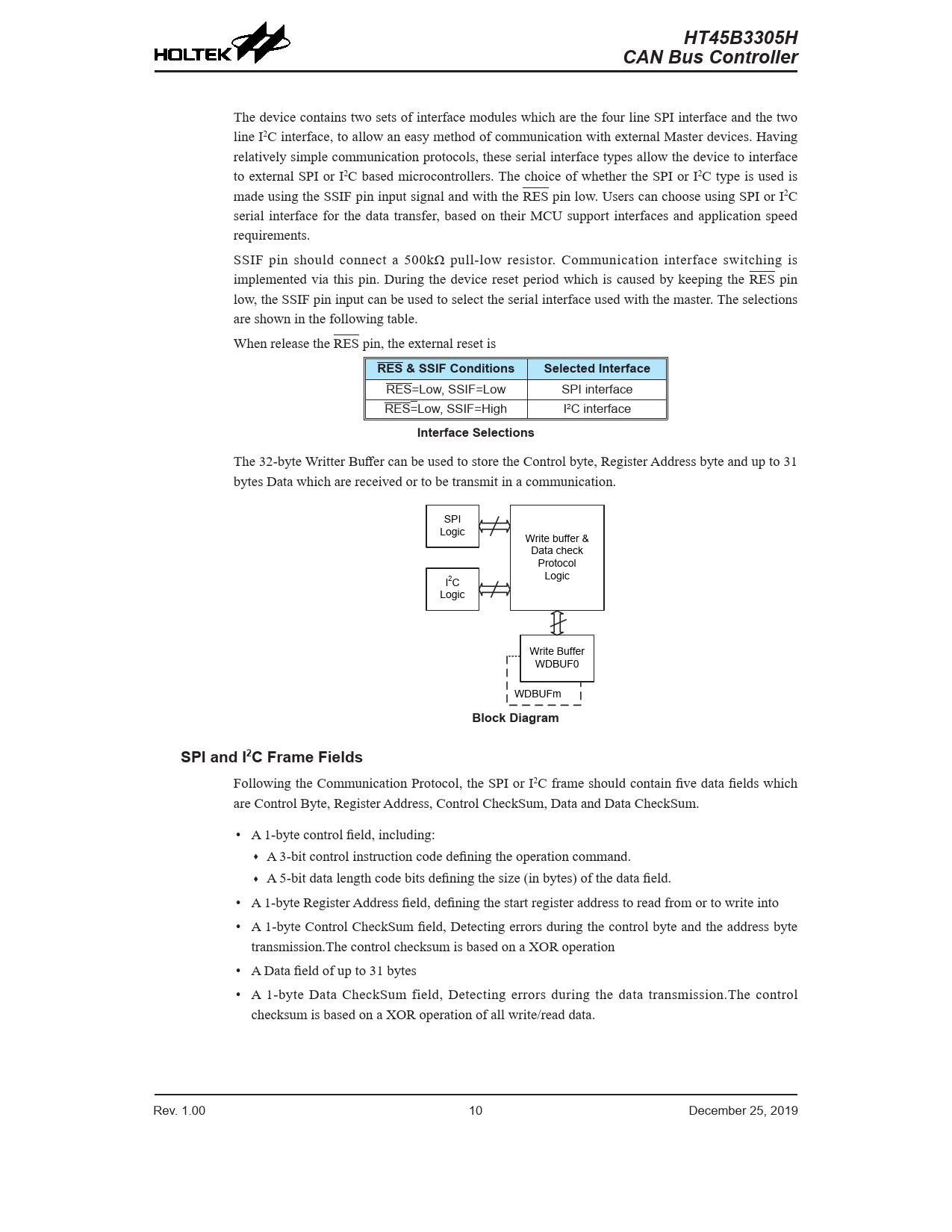 HT45B3305HHT45B3305HCAN Bus ControllerCAN Bus Controller The device contains two sets of interface modules which are the four line SPI interface and the two line I2C interface, to allow an easy method of communication with external Master devices. Having relatively simple communication protocols, these serial interface types allow the device to interface to external SPI or I2C based microcontrollers. The choice of whether the SPI or I2C type is used is made using the SSIF pin input signal and with the RES pin low. Users can choose using SPI or I2C serial interface for the data transfer, based on their MCU support interfaces and application speed requirements. SSIF pin should connect a 500kΩ pull-low resistor. Communication interface switching is implemented via this pin. During the device reset period which is caused by keeping the RES pin low, the SSIF pin input can be used to select the serial interface used with the master. The selections are shown in the following table. When release the RES pin, the external reset is RES & SSIF ConditionsSelected Interface RES=Low, SSIF=Low SPI interface RES=Low, SSIF=High I2C interface Interface Selections The 32-byte Writter Buffer can be used to store the Control byte, Register Address byte and up to 31 bytes Data which are received or to be transmit in a communication. SPI Logic Write buffer & Data check Protocol I2C Logic Logic Write Buffer WDBUF0 WDBUFm Block DiagramSPI and I2C Frame Fields Following the Communication Protocol, the SPI or I2C frame should contain five data fields which are Control Byte, Register Address, Control CheckSum, Data and Data CheckSum. • A 1-byte control field, including: ♦ A 3-bit control instruction code defining the operation command. ♦ A 5-bit data length code bits defining the size (in bytes) of the data field. • A 1-byte Register Address field, defining the start register address to read from or to write into • A 1-byte Control CheckSum field, Detecting errors during the control byte and the address byte transmission.The control checksum is based on a XOR operation • A Data field of up to 31 bytes • A 1-byte Data CheckSum field, Detecting errors during the data transmission.The control checksum is based on a XOR operation of all write/read data. Rev. 1.00 10 December 25, 2019 Rev. 1.00 11 December 25, 2019 Document Outline Features Applications General Description Block Diagram Pin Assignment Pin Description Absolute Maximum Ratings D.C. Characteristics A.C. Characteristics System Frequency Characteristics Timing Characteristics Operating Voltage Characteristics Operating Current Characteristics Standby Current Characteristics CAN Electrical Characteristics Power-on Reset Characteristics Power Control Function CLKOUT Pin IDLE Mode SLEEP Mode and Wake-up Functional Description Write Buffer and Data Check SPI and I2C Frame Fields SPI Serial Interface I2C Serial Interface HT45B3305H CAN Block Diagram Interrupt Output Pins Message RAM and FIFO Buffer Configuration HT45B3305H CAN Operating Modes CAN Application Register Description Register Map Register Reset Condition Register Description Application Circuits SPI Serial Interface I2C Serial Interface Package Information 16-pin NSOP (150mil) Outline Dimensions SAW Type 16-pin QFN (3mm×3mm for FP0.25mm) Outline Dimensions