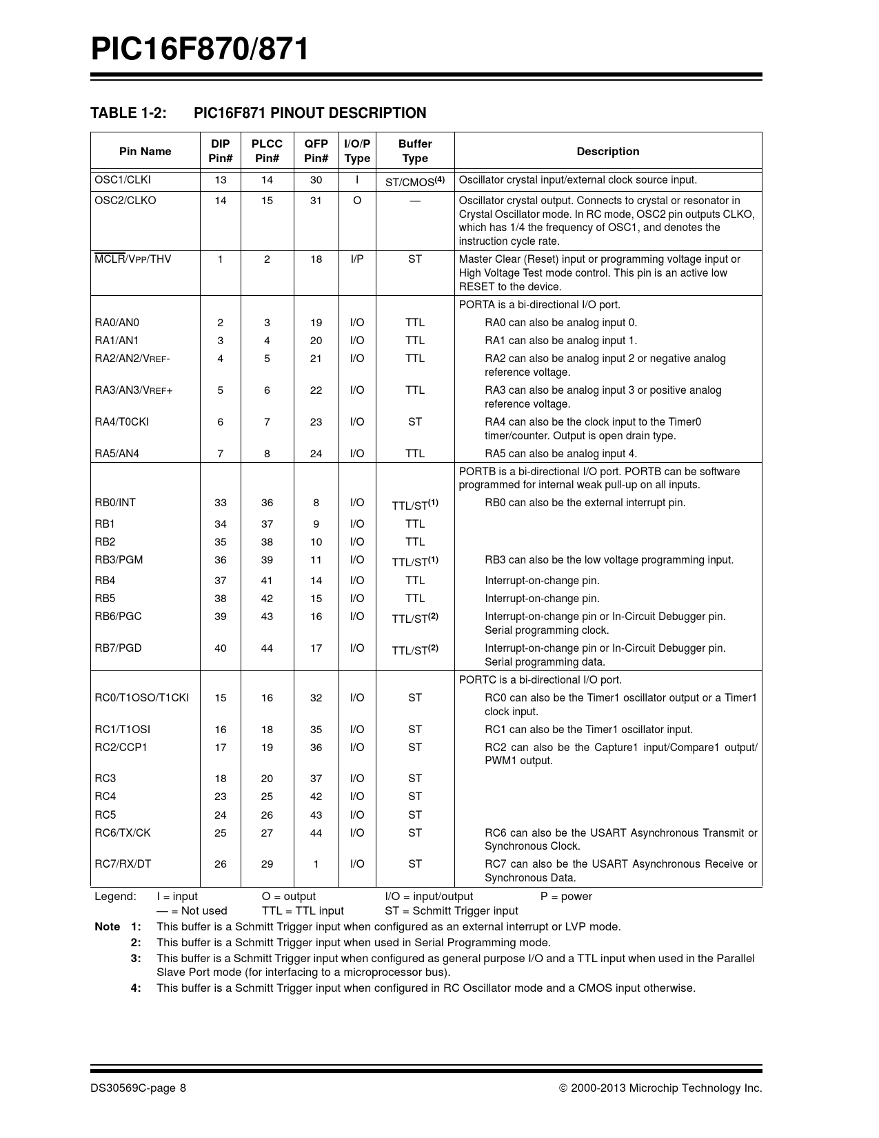 PIC16F870/871. TABLE 1-2:. PIC16F871 PINOUT DESCRIPTION. DIP. PLCC. QFP. I/O/P. Buffer. Pin Name. Description. Pin#. Type. (4). (1). (2). Note