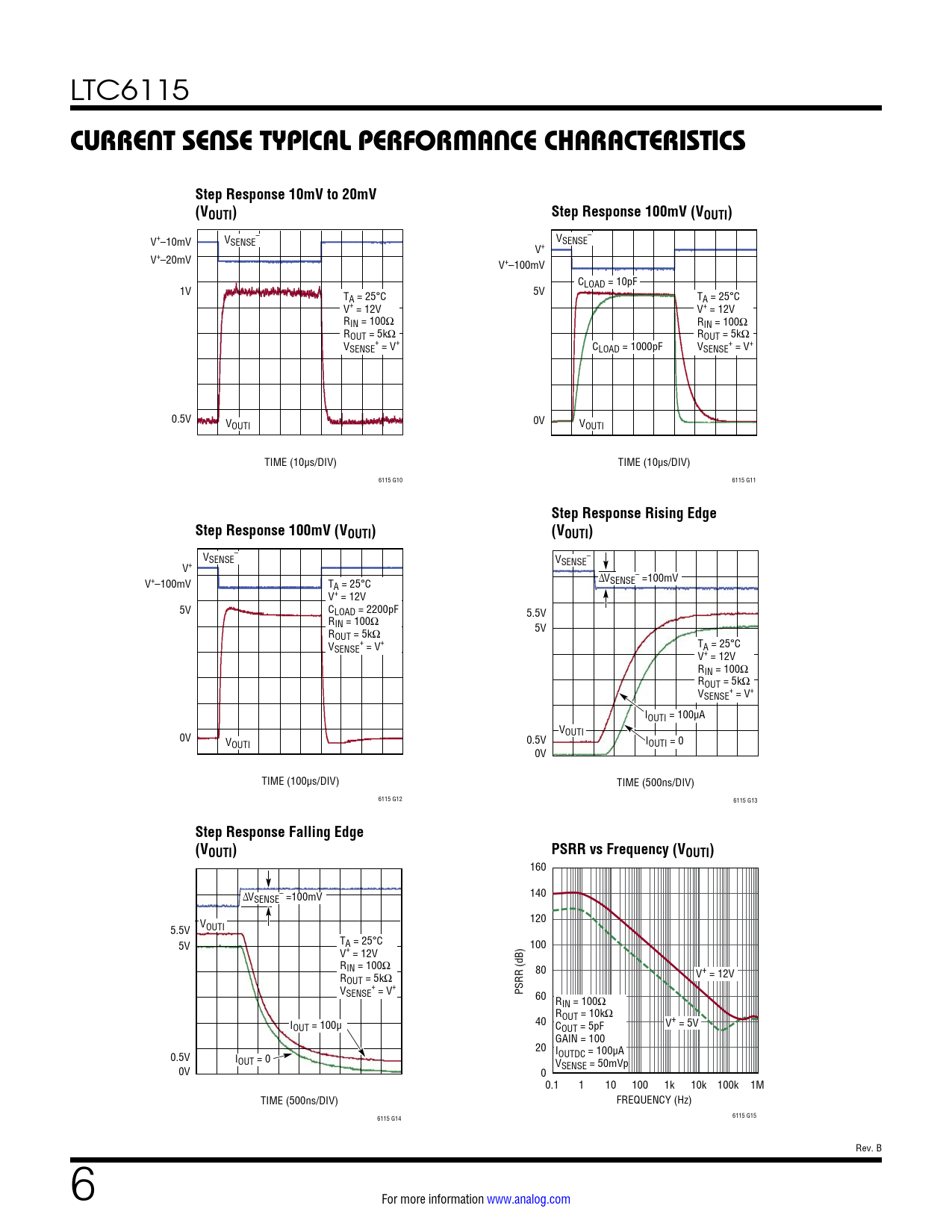 V – SENSE V – V+ SENSE – V+–100mV T ∆VSENSE =100mV A = 25°C V+ = 12V 5V CLOAD = 2200pF 5.5V RIN = 100Ω R 5V OUT = 5kΩ V + SENSE = V+ TA = 25°C V+ = 12V RIN = 100Ω ROUT = 5kΩ V + SENSE = V+ IOUTI = 100µA V 0V OUTI VOUTI 0.5V IOUTI = 0 0V TIME (100µs/DIV) TIME (500ns/DIV) 6115 G12 6115 G13