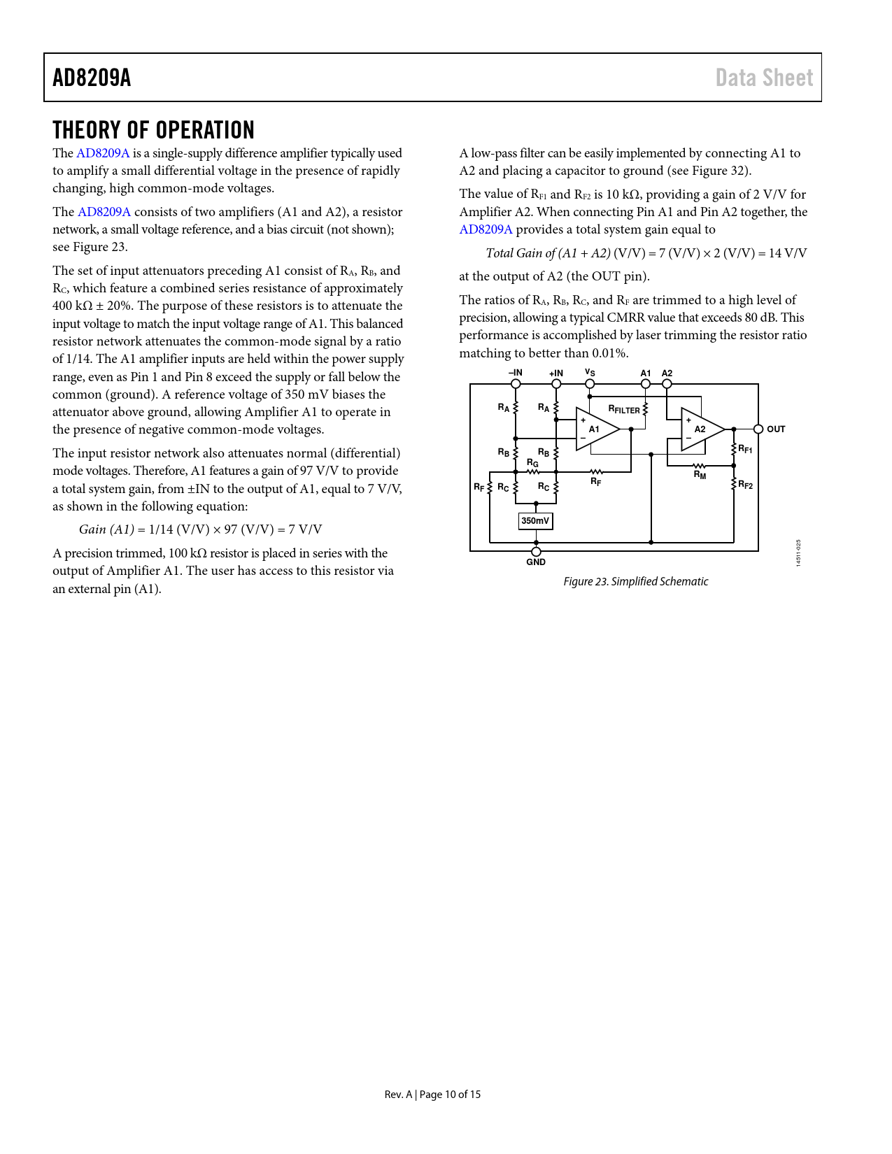 link to page 10 link to page 13 AD8209AData SheetTHEORY OF OPERATION The AD8209A is a single-supply difference amplifier typically used A low-pass filter can be easily implemented by connecting A1 to to amplify a small differential voltage in the presence of rapidly A2 and placing a capacitor to ground (see Figure 32). changing, high common-mode voltages. The value of RF1 and RF2 is 10 kΩ, providing a gain of 2 V/V for The AD8209A consists of two amplifiers (A1 and A2), a resistor Amplifier A2. When connecting Pin A1 and Pin A2 together, the network, a smal voltage reference, and a bias circuit (not shown); AD8209A provides a total system gain equal to see Figure 23. Total Gain of (A1 + A2) (V/V) = 7 (V/V) × 2 (V/V) = 14 V/V The set of input attenuators preceding A1 consist of RA, RB, and at the output of A2 (the OUT pin). RC, which feature a combined series resistance of approximately 400 kΩ ± 20%. The purpose of these resistors is to attenuate the The ratios of RA, RB, RC, and RF are trimmed to a high level of input voltage to match the input voltage range of A1. This balanced precision, al owing a typical CMRR value that exceeds 80 dB. This resistor network attenuates the common-mode signal by a ratio performance is accomplished by laser trimming the resistor ratio of 1/14. The A1 amplifier inputs are held within the power supply matching to better than 0.01%. range, even as Pin 1 and Pin 8 exceed the supply or fal below the –INV+INSA1A2 common (ground). A reference voltage of 350 mV biases the attenuator above ground, allowing Amplifier A1 to operate in RARARFILTER++ the presence of negative common-mode voltages. A1A2OUT–– The input resistor network also attenuates normal (differential) RRRF1BB mode voltages. Therefore, A1 features a gain of 97 V/V to provide RGRM a total system gain, from ±IN to the output of A1, equal to 7 V/V, RRRFRFCRCF2 as shown in the following equation: Gain (A1) = 1/14 (V/V) × 97 (V/V) = 7 V/V 350mV A precision trimmed, 100 kΩ resistor is placed in series with the 025 1- 1 output of Amplifier A1. The user has access to this resistor via GND 145 an external pin (A1). Figure 23. Simplified Schematic Rev. A | Page 10 of 15 Document Outline FEATURES APPLICATIONS FUNCTIONAL BLOCK DIAGRAM GENERAL DESCRIPTION REVISION HISTORY SPECIFICATIONS ABSOLUTE MAXIMUM RATINGS ESD CAUTION PIN CONFIGURATION AND FUNCTION DESCRIPTIONS TYPICAL PERFORMANCE CHARACTERISTICS THEORY OF OPERATION APPLICATIONS INFORMATION HIGH-SIDE CURRENT SENSINGWITH A LOW-SIDE SWITCH HIGH RAIL CURRENT SENSING LOW-SIDE CURRENT SENSING 4 mA to 20 mA Current Loop Receiver GAIN ADJUSTMENT Gains Less than 14 Gains Greater than 14 GAIN TRIM Internal Signal Overload Considerations LOW-PASS FILTERING HIGH LINE CURRENT SENSING WITH LOW-PASS FILTERING AND GAIN ADJUSTMENT OUTLINE DIMENSIONS ORDERING GUIDE AUTOMOTIVE PRODUCTS