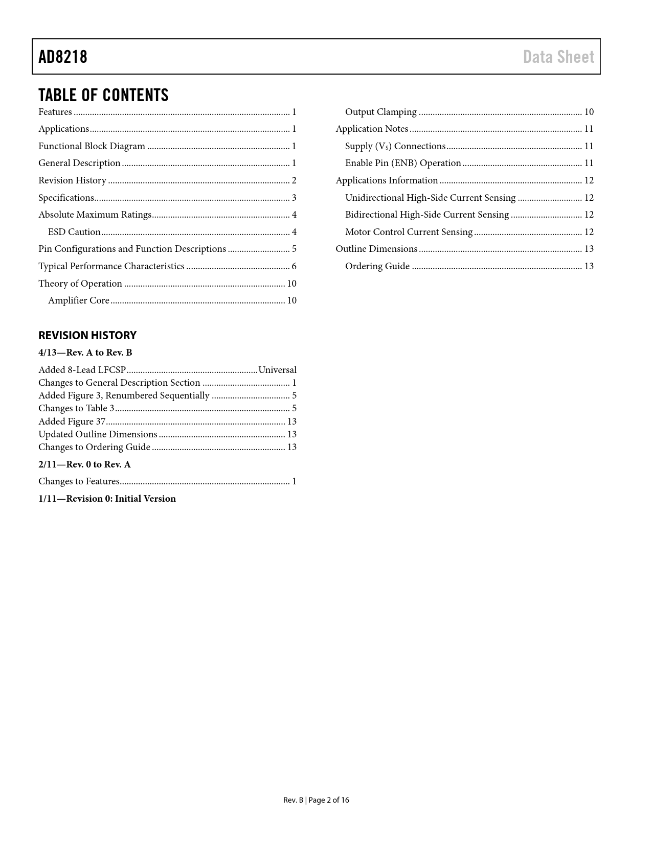 Pages / Page16 / 2 — AD8218. Data Sheet. TABLE OF CONTENTS. REVISION HISTORY 4/13—Rev. A to …