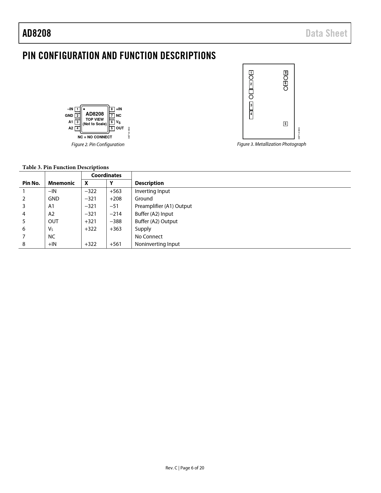 AD8208Data SheetPIN CONFIGURATION AND FUNCTION DESCRIPTIONS18263–IN18+INGNDAD8208427NCTOP VIEWA136VS(Not to Scale)5A245OUT 002 003 NC = NO CONNECT 08714- 08714- Figure 2. Pin Configuration Figure 3. Metallization Photograph Table 3. Pin Function DescriptionsCoordinatesPin No.MnemonicXYDescription 1 −IN −322 +563 Inverting Input 2 GND −321 +208 Ground 3 A1 −321 −51 Preamplifier (A1) Output 4 A2 −321 −214 Buffer (A2) Input 5 OUT +321 −388 Buffer (A2) Output 6 VS +322 +363 Supply 7 NC No Connect 8 +IN +322 +561 Noninverting Input Rev. C | Page 6 of 20 Document Outline Features Applications Functional Block Diagram General Description Revision History Specifications Absolute Maximum Ratings ESD Caution Pin Configuration and Function Descriptions Typical Performance Characteristics Theory of Operation Applications Information High-Side Current Sensing with a Low-Side Switch High-Rail Current Sensing Low-Side Current Sensing 4 mA to 20 mA Current Loop Receiver Gain Adjustment Gains Less than 20 Gains Greater than 20 Gain Trim Internal Signal Overload Considerations Low-Pass Filtering High Line Current Sensing with LPF and Gain Adjustment Outline Dimensions Ordering Guide Automotive Products