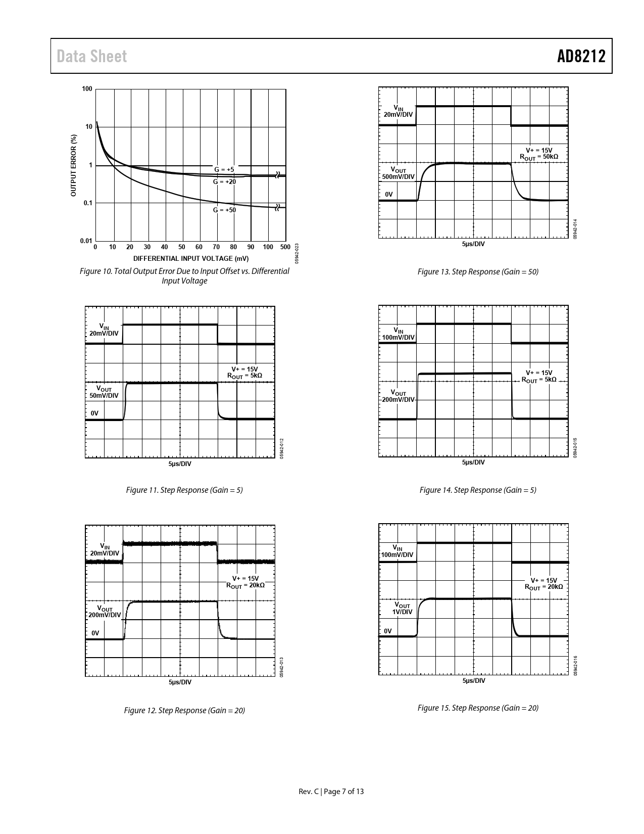 Data Sheet. AD8212. 100. VIN. 20mV/DIV. ) % R (. V+ = 15V. ROUT = 50kΩ. RRO. G = +5. VOUT. 500mV/DIV. G = +20. UT O. 0.1. G = +50. 0.01. 100 500. 5µs/DIV