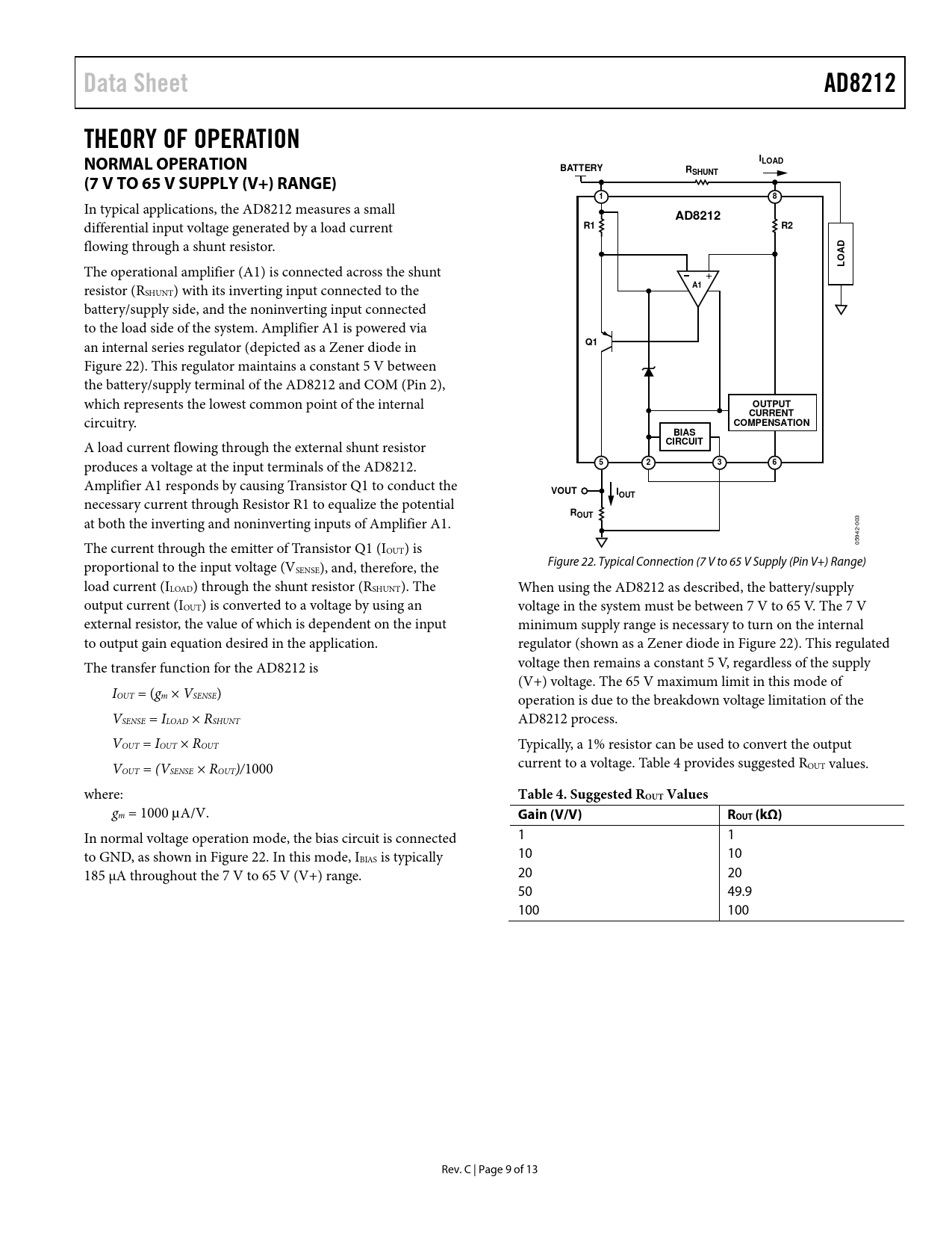 link to page 9 link to page 9 link to page 9 link to page 9 Data SheetAD8212THEORY OF OPERATION NORMAL OPERATIONILOADBATTERYRSHUNT(7 V TO 65 V SUPPLY (V+) RANGE)18 In typical applications, the AD8212 measures a small AD8212 differential input voltage generated by a load current R1R2 flowing through a shunt resistor. D The operational amplifier (A1) is connected across the shunt LOA resistor (R A1 SHUNT) with its inverting input connected to the battery/supply side, and the noninverting input connected to the load side of the system. Amplifier A1 is powered via an internal series regulator (depicted as a Zener diode in Q1 Figure 22). This regulator maintains a constant 5 V between the battery/supply terminal of the AD8212 and COM (Pin 2), which represents the lowest common point of the internal OUTPUT circuitry. CURRENTCOMPENSATIONBIAS A load current flowing through the external shunt resistor CIRCUIT produces a voltage at the input terminals of the AD8212. 5236 Amplifier A1 responds by causing Transistor Q1 to conduct the VOUTIOUT necessary current through Resistor R1 to equalize the potential R at both the inverting and noninverting inputs of Amplifier A1. OUT 003 The current through the emitter of Transistor Q1 (I 05942- OUT) is proportional to the input voltage (V Figure 22. Typical Connection (7 V to 65 V Supply (Pin V+) Range) SENSE), and, therefore, the load current (ILOAD) through the shunt resistor (RSHUNT). The When using the AD8212 as described, the battery/supply output current (IOUT) is converted to a voltage by using an voltage in the system must be between 7 V to 65 V. The 7 V external resistor, the value of which is dependent on the input minimum supply range is necessary to turn on the internal to output gain equation desired in the application. regulator (shown as a Zener diode in Figure 22). This regulated The transfer function for the AD8212 is voltage then remains a constant 5 V, regardless of the supply (V+) voltage. The 65 V maximum limit in this mode of IOUT = (gm × VSENSE) operation is due to the breakdown voltage limitation of the VSENSE = ILOAD × RSHUNT AD8212 process. VOUT = IOUT × ROUT Typically, a 1% resistor can be used to convert the output V current to a voltage. Table 4 provides suggested R OUT = (VSENSE × ROUT)/1000 OUT values. where: Table 4. Suggested ROUT Values gm = 1000 µA/V. Gain (V/V)ROUT (kΩ) In normal voltage operation mode, the bias circuit is connected 1 1 to GND, as shown in Figure 22. In this mode, I 10 10 BIAS is typically 185 µA throughout the 7 V to 65 V (V+) range. 20 20 50 49.9 100 100 Rev. C | Page 9 of 13 Document Outline FEATURES APPLICATIONS FUNCTIONAL BLOCK DIAGRAM GENERAL DESCRIPTION TABLE OF CONTENTS REVISION HISTORY SPECIFICATIONS ABSOLUTE MAXIMUM RATINGS ESD CAUTION PIN CONFIGURATION AND FUNCTION DESCRIPTIONS TYPICAL PERFORMANCE CHARACTERISTICS THEORY OF OPERATION NORMAL OPERATION (7 V TO 65 V SUPPLY (V+) RANGE) HIGH VOLTAGE OPERATION USING AN EXTERNAL PNP TRANSISTOR OUTPUT CURRENT COMPENSATION CIRCUIT APPLICATIONS INFORMATION GENERAL HIGH-SIDE CURRENT SENSING MOTOR CONTROL 500 V CURRENT MONITOR BIDIRECTIONAL CURRENT SENSING OUTLINE DIMENSIONS ORDERING GUIDE
