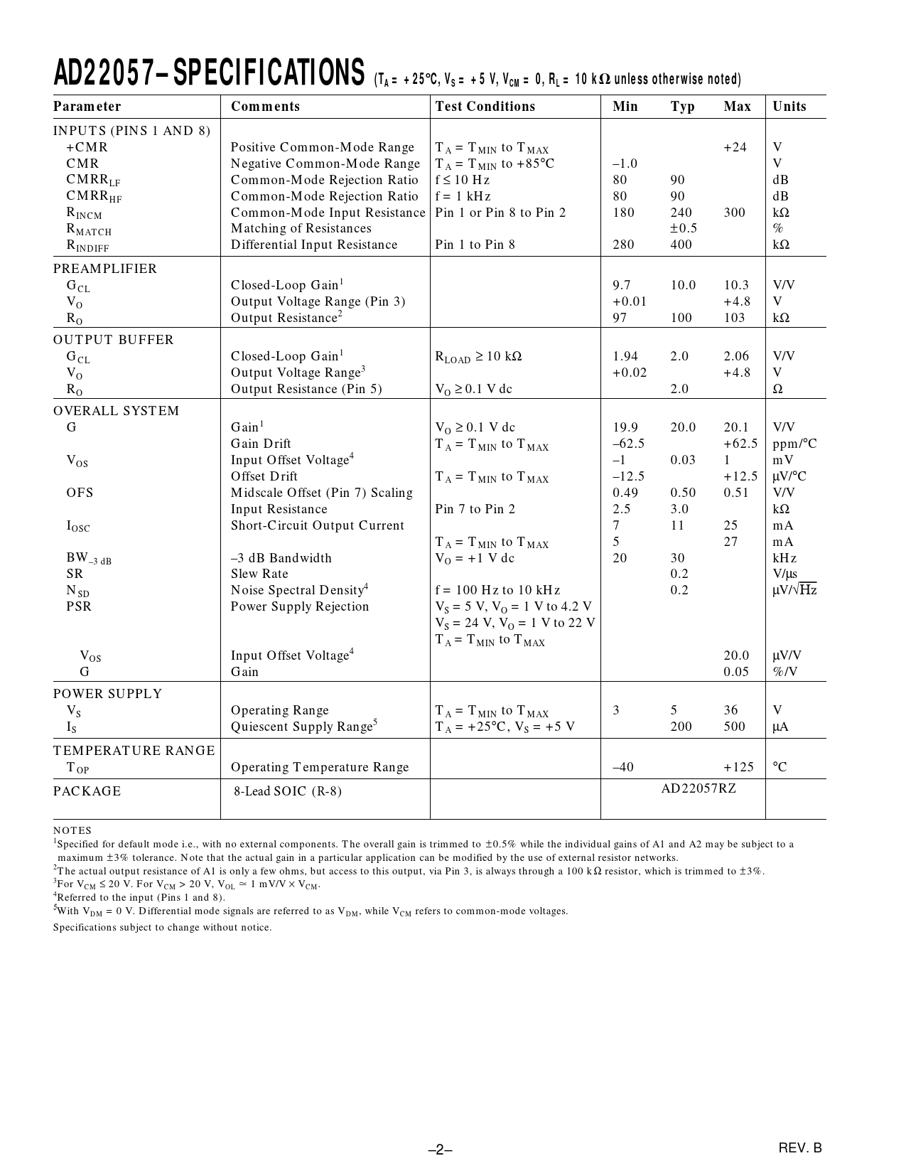 AD22057–SPECIFICATIONS (TA = +25 C, VS = +5 V, VCM = 0, RL = 10 k unless otherwise noted) Parameter Comments