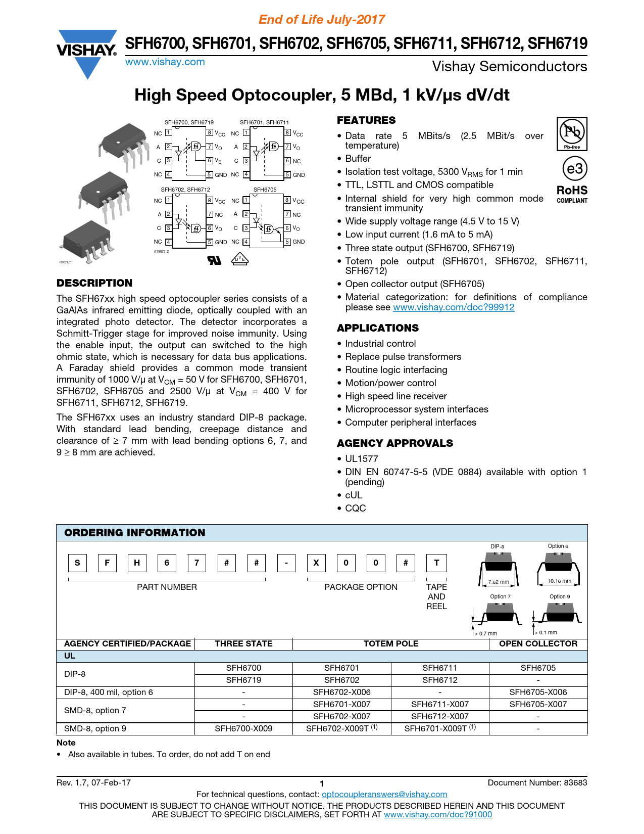 End of Life July-2017 SFH6700, SFH6701, SFH6702, SFH6705, SFH6711, SFH6712, SFH6719