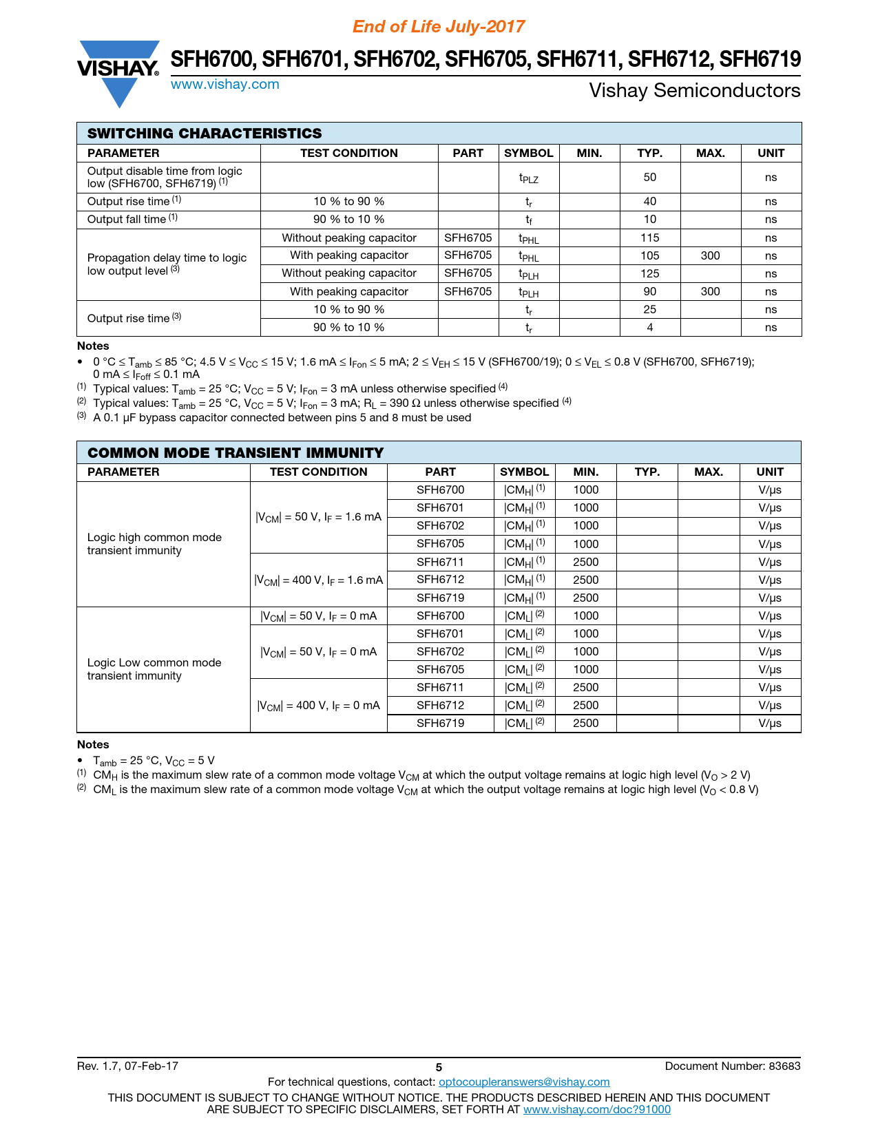 End of Life July-2017 SFH6700, SFH6701, SFH6702, SFH6705, SFH6711, SFH6712, SFH6719