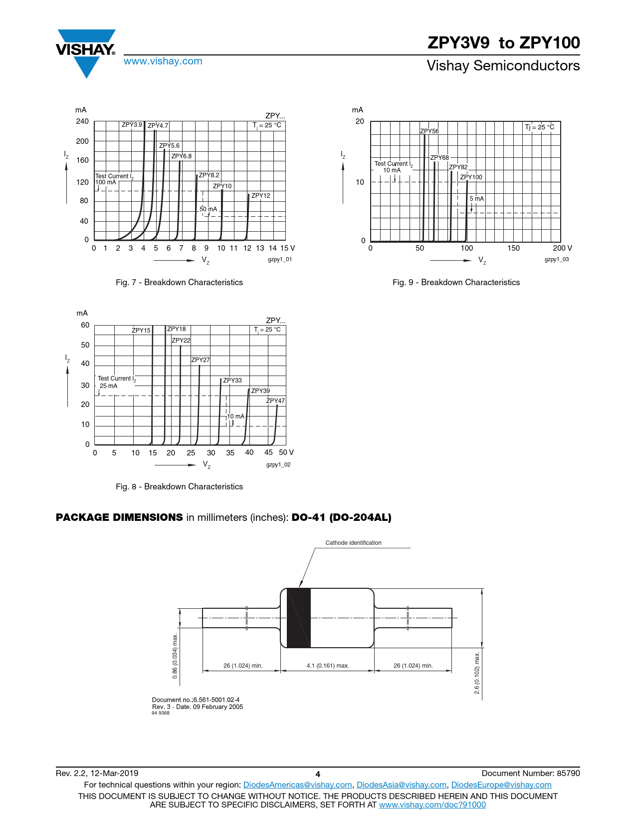 ZPY3V9 to ZPY100 www.vishay.com Vishay Semiconductors mA mA ZPY... 240 20 ZPY3.9 ZPY4.7 T = 25 °C j Tj = 25 °C ZPY56 200 ZPY5.6 I I Z ZPY6.8 160 Z ZPY68 Test Current lZ ZPY82 10 mA Test Current l ZPY8.2 ZPY100 120 Z 100 mA 10 ZPY10 ZPY12 80 5 mA 50 mA 40 0 0 0 1 2 3 4 5 6 7 8 9 10 11 12 13 14 15 V 0 50 100 150 200 V V gzpy1_01 V gzpy1_03 Z Z Fig. 7 - Breakdown Characteristics Fig. 9 - Breakdown Characteristics mA ZPY... 60 ZPY18 ZPY15 T = 25 °C j ZPY22 50 IZ ZPY27 40 Test Current lZ ZPY33 30 25 mA ZPY39 20 ZPY47 10 mA 10 0 0 5 10 15 20 25 30 35 40 45 50 V V gzpy1_02 Z Fig. 8 - Breakdown Characteristics PACKAGE DIMENSIONS in millimeters (inches): DO-41 (DO-204AL) Cathode identification 26 (1.024) min. 4.1 (0.161) max. 26 (1.024) min. 0.86 (0.034) max. 2.6 (0.102) max. 94 9368 Rev. 2.2, 12-Mar-2019 4 Document Number: 85790 For technical questions within your region: DiodesAmericas@vishay.com, DiodesAsia@vishay.com, DiodesEurope@vishay.com THIS DOCUMENT IS SUBJECT TO CHANGE WITHOUT NOTICE. THE PRODUCTS DESCRIBED HEREIN AND THIS DOCUMENT ARE SUBJECT TO SPECIFIC DISCLAIMERS, SET FORTH AT www.vishay.com/doc?91000