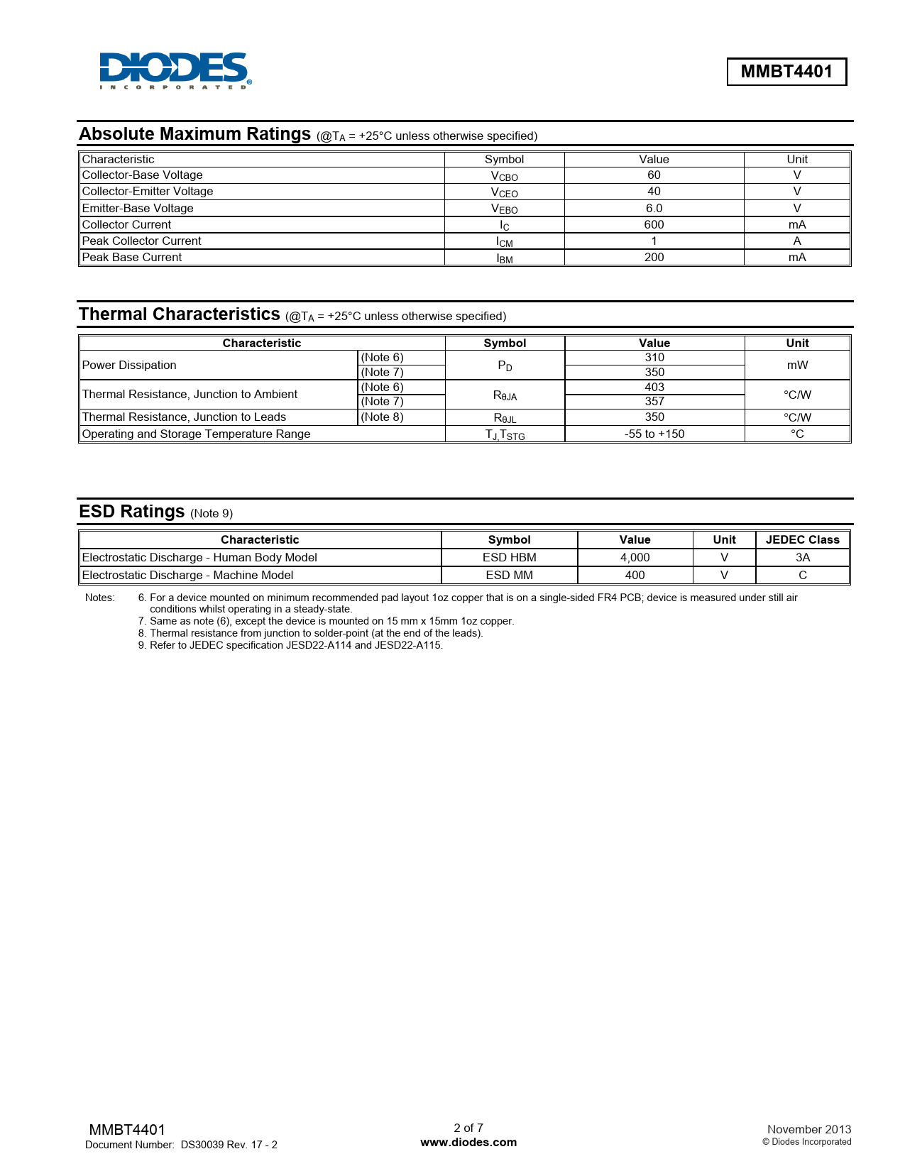 MMBT4401. Absolute Maximum Ratings. Thermal Characteristics. Characteristic Symbol. Value. Unit. ESD Ratings. JEDEC. Class