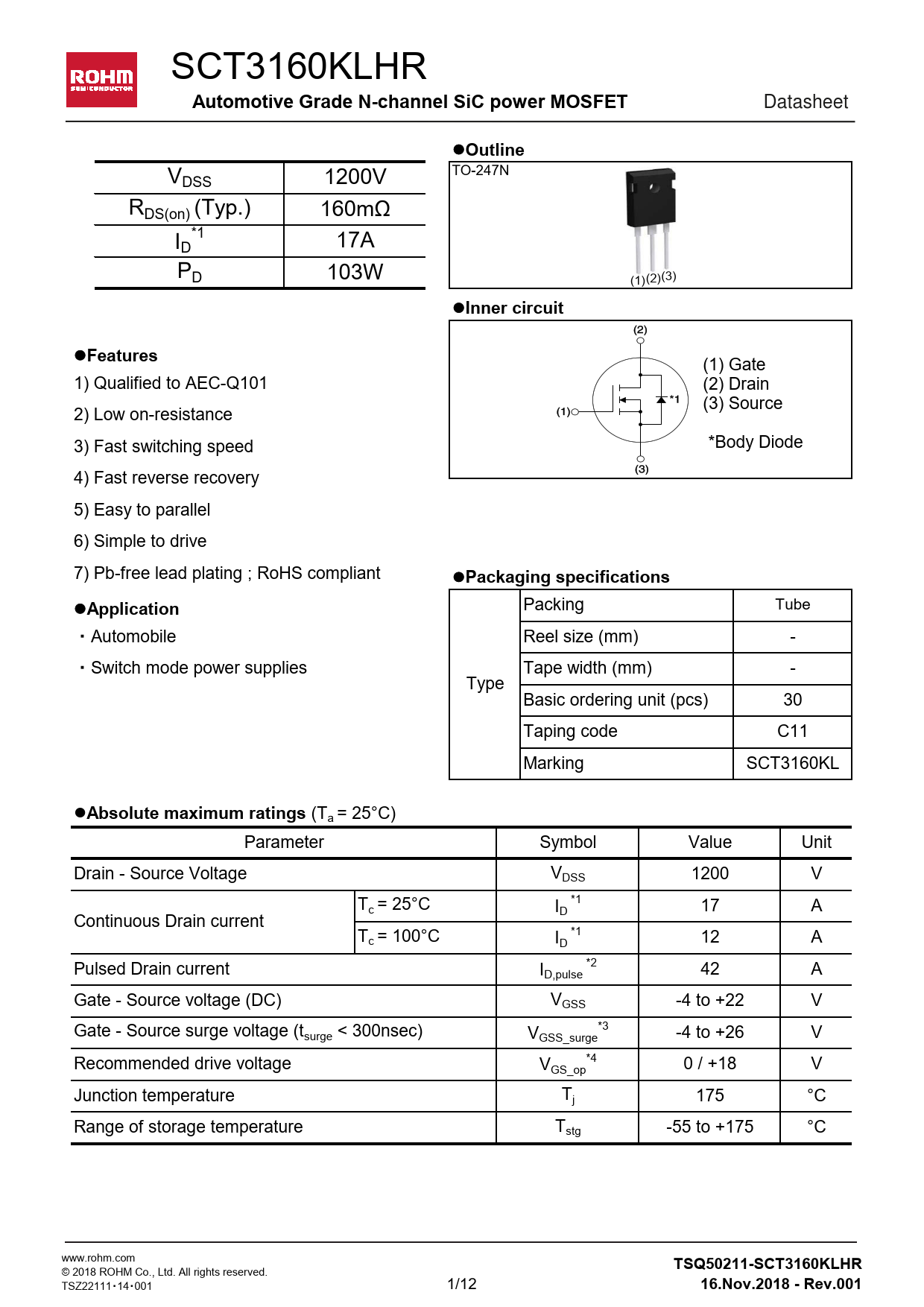 Automotive Grade N-channel SiC power MOSFET. Outline. Inner circuit. Features. Packaging specifications. Application