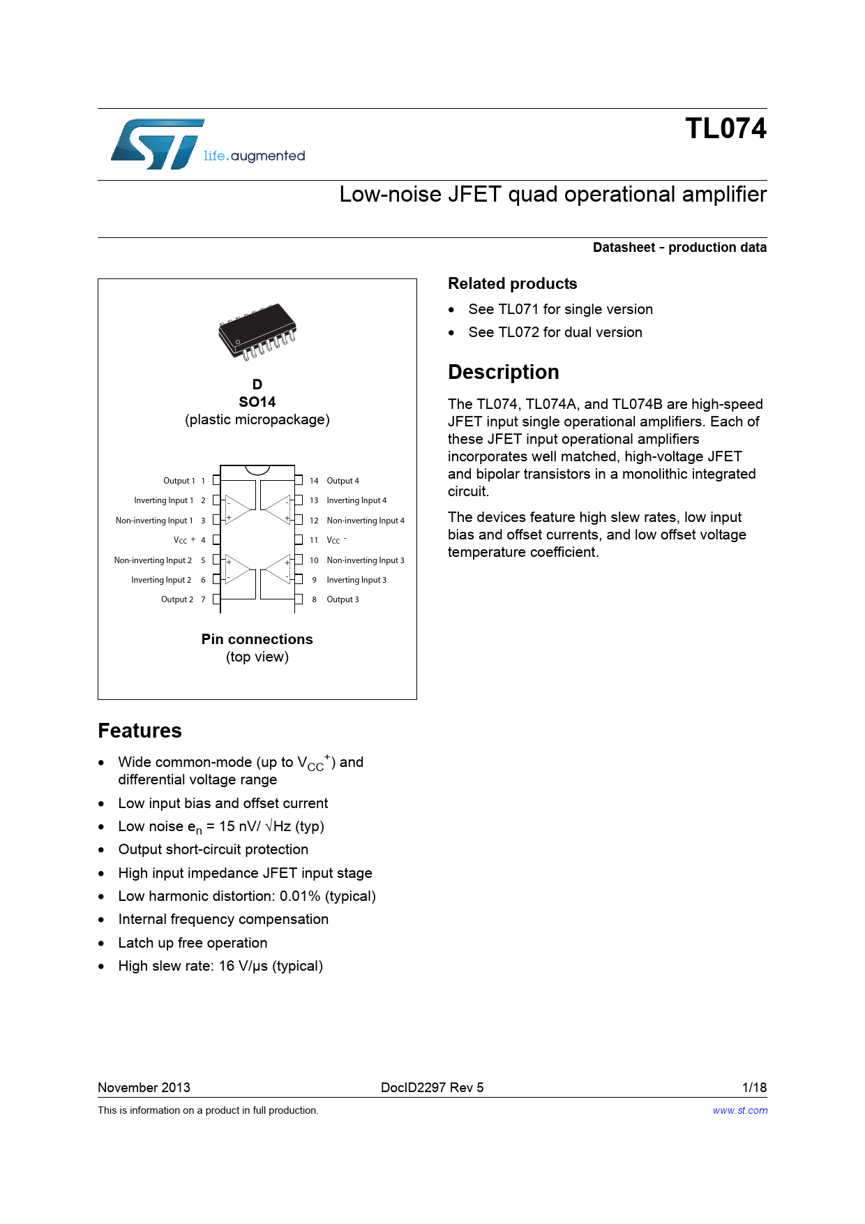 Pages / Page18 / 1 — TL074. Datasheet. production data. Related products. Description. SO14. …