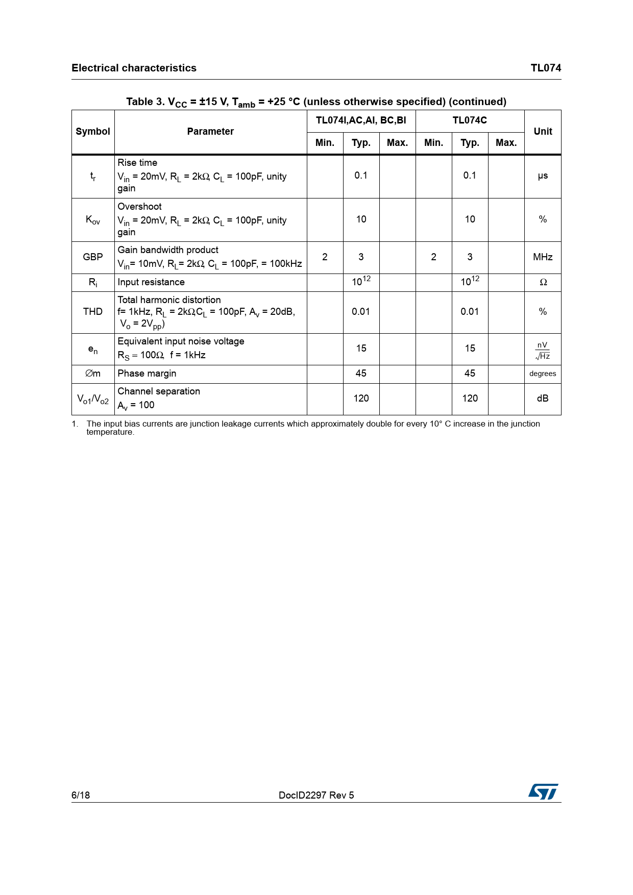Electrical characteristics. TL074. Table 3. VCC = ±15 V, Tamb = +25 °C (unless otherwise specified) (continued)