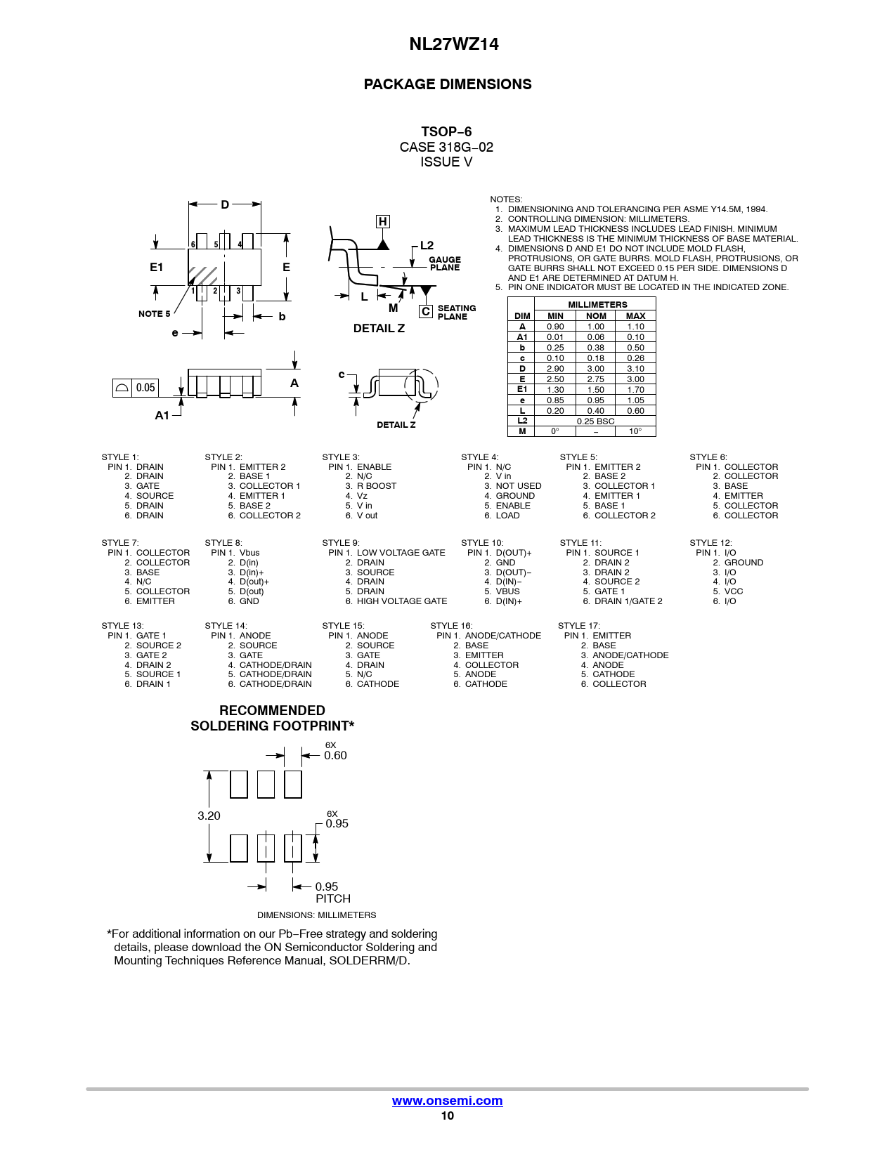 NL27WZ14. PACKAGE DIMENSIONS. TSOP−6. GAUGE. PLANE. MILLIMETERS. NOTE 5. SEATING. C PLANE. DIM. MIN. NOM. MAX. DETAIL Z. RECOMMENDED