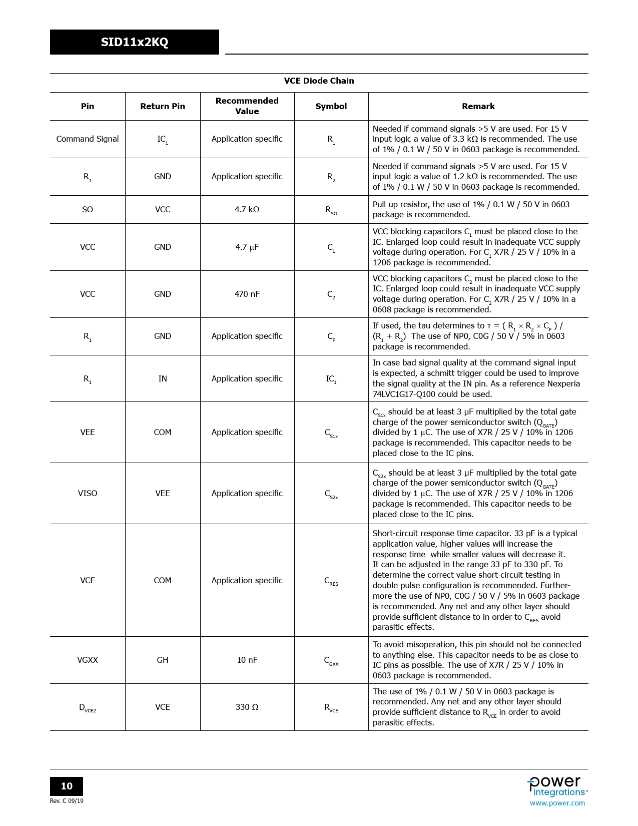 SID11x2KQVCE Diode ChainPinReturn PinRecommendedValueSymbolRemark Needed if command signals >5 V are used. For 15 V Command Signal IC Application specific R input logic a value of 3.3 kW is recommended. The use 1 1 of 1% / 0.1 W / 50 V in 0603 package is recommended. Needed if command signals >5 V are used. For 15 V R GND Application specific R input logic a value of 1.2 kW is recommended. The use 1 2 of 1% / 0.1 W / 50 V in 0603 package is recommended. Pull up resistor, the use of 1% / 0.1 W / 50 V in 0603 SO VCC 4.7 kW RSO package is recommended. VCC blocking capacitors C must be placed close to the 1 VCC GND 4.7 IC. Enlarged loop could result in inadequate VCC supply µF C1 voltage during operation. For C X7R / 25 V / 10% in a 1 1206 package is recommended. VCC blocking capacitors C must be placed close to the 2 VCC GND 470 nF C IC. Enlarged loop could result in inadequate VCC supply 2 voltage during operation. For C X7R / 25 V / 10% in a 2 0608 package is recommended. If used, the tau determines to τ = ( R × R × C ) / 1 2 F R GND Application specific C (R + R ) The use of NP0, C0G / 50 V / 5% in 0603 1 F 1 2 package is recommended. In case bad signal quality at the command signal input is expected, a schmitt trigger could be used to improve R IN Application specific IC 1 1 the signal quality at the IN pin. As a reference Nexperia 74LVC1G17-Q100 could be used. C should be at least 3 μF multiplied by the total gate S1x charge of the power semiconductor switch (Q ) GATE VEE COM Application specific C divided by 1 µC. The use of X7R / 25 V / 10% in 1206 S1x package is recommended. This capacitor needs to be placed close to the IC pins. C should be at least 3 μF multiplied by the total gate S2x charge of the power semiconductor switch (Q ) GATE VISO VEE Application specific C divided by 1 µC. The use of X7R / 25 V / 10% in 1206 S2x package is recommended. This capacitor needs to be placed close to the IC pins. Short-circuit response time capacitor. 33 pF is a typical application value, higher values will increase the response time while smal er values will decrease it. It can be adjusted in the range 33 pF to 330 pF. To VCE COM Application specific C determine the correct value short-circuit testing in RES double pulse configuration is recommended. Further- more the use of NP0, C0G / 50 V / 5% in 0603 package is recommended. Any net and any other layer should provide sufficient distance to in order to C avoid RES parasitic effects. To avoid misoperation, this pin should not be connected to anything else. This capacitor needs to be as close to VGXX GH 10 nF CGXX IC pins as possible. The use of X7R / 25 V / 10% in 0603 package is recommended. The use of 1% / 0.1 W / 50 V in 0603 package is D VCE 330 recommended. Any net and any other layer should W R VCE2 VCE provide sufficient distance to R in order to avoid VCE parasitic effects. 10 Rev. C 09/19 www.power.com Document Outline Product Highlights Description Scale-iDriver − Product Portfolio Pin Functional Description SCALE-iDriver Functional Description Application Examples and Components Selection Power Dissipation and IC Junction Temperature Estimation Absolute Maximum Ratings Thermal Resistance Key Electrical Characteristics Typical Performance Characteristics eSOP-R16B (K Package) MSL Table ESD and Latch-Up Table IEC 60664-1 Rating Table Electrical Characteristics (EMI) Table Regulatory Information Table Part Ordering Information