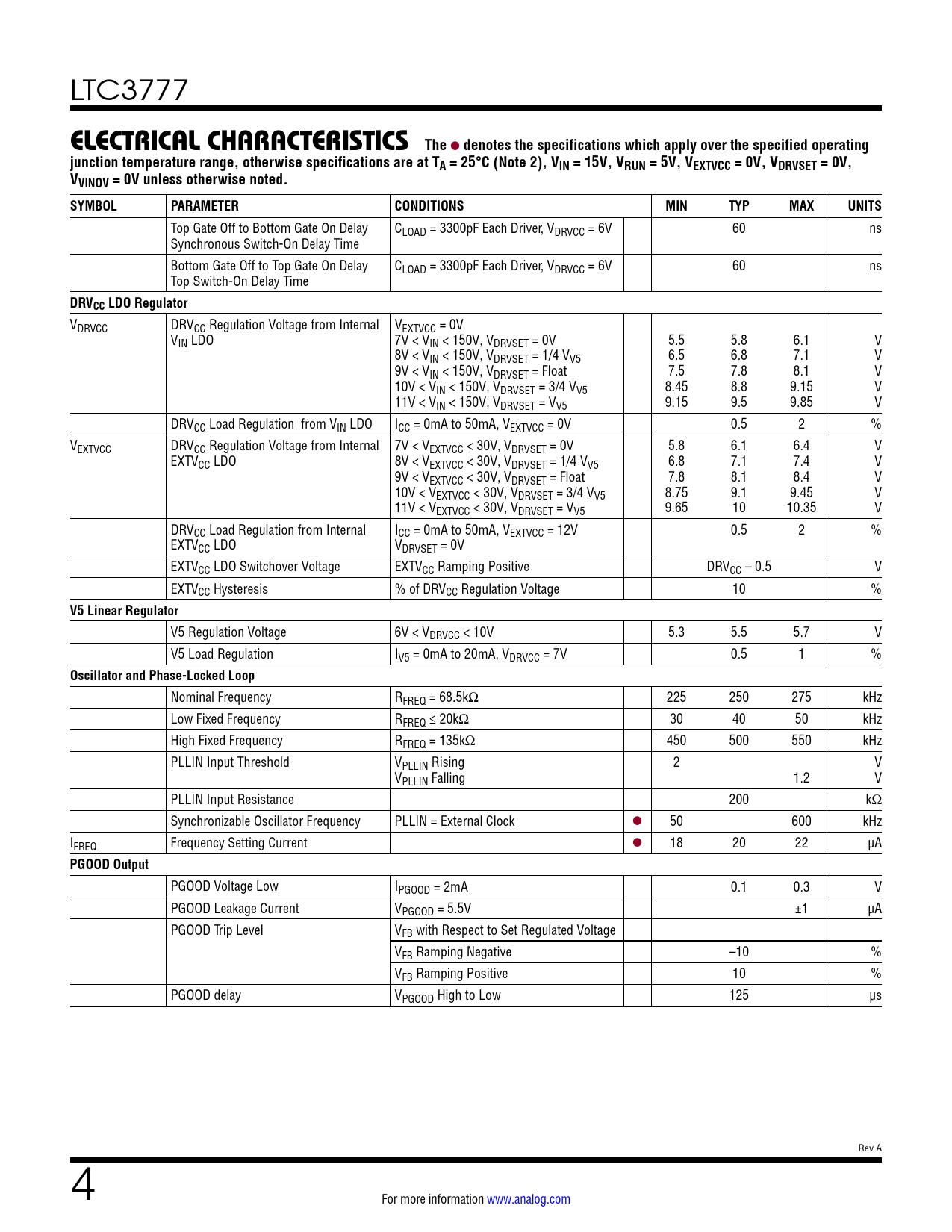 VDRVCC DRVCC Regulation Voltage from Internal VEXTVCC = 0V VIN LDO 7V < VIN < 150V, VDRVSET = 0V 5.5 5.8 6.1 V 8V < VIN < 150V, VDRVSET = 1/4 VV5 6.5 6.8 7.1 V 9V < VIN < 150V, VDRVSET = Float 7.5 7.8 8.1 V 10V < VIN < 150V, VDRVSET = 3/4 VV5 8.45 8.8 9.15 V 11V < VIN < 150V, VDRVSET = VV5 9.15 9.5 9.85 V DRVCC Load Regulation from VIN LDO ICC = 0mA to 50mA, VEXTVCC = 0V 0.5 2 % VEXTVCC DRVCC Regulation Voltage from Internal 7V < VEXTVCC < 30V, VDRVSET = 0V 5.8 6.1 6.4 V EXTVCC LDO 8V < VEXTVCC < 30V, VDRVSET = 1/4 VV5 6.8 7.1 7.4 V 9V < VEXTVCC < 30V, VDRVSET = Float 7.8 8.1 8.4 V 10V < VEXTVCC < 30V, VDRVSET = 3/4 VV5 8.75 9.1 9.45 V 11V < VEXTVCC < 30V, VDRVSET = VV5 9.65 10 10.35 V DRVCC Load Regulation from Internal ICC = 0mA to 50mA, VEXTVCC = 12V 0.5 2 % EXTVCC LDO VDRVSET = 0V EXTVCC LDO Switchover Voltage EXTVCC Ramping Positive DRVCC – 0.5 V EXTVCC Hysteresis % of DRVCC Regulation Voltage 10 %