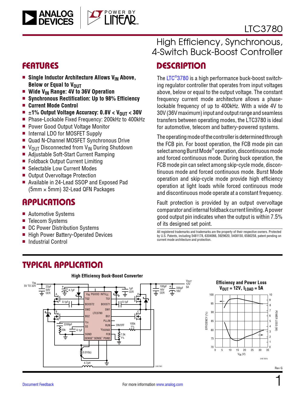 LTC3780 High Efficiency, Synchronous, 4-Switch Buck-Boost Controller FEATURESDESCRIPTION n Single Inductor Architecture Allows VIN Above, The LTC®3780 is a high performance buck-boost switch- Below or Equal to VOUT ing regulator controller that operates from input voltages n Wide VIN Range: 4V to 36V Operation above, below or equal to the output voltage. The constant n Synchronous Rectification: Up to 98% Efficiency frequency current mode architecture allows a phase- n Current Mode Control lockable frequency of up to 400kHz. With a wide 4V to n ± 1% Output Voltage Accuracy: 0.8V < VOUT < 30V 30V (36V maximum) input and output range and seamless n Phase-Lockable Fixed Frequency: 200kHz to 400kHz transfers between operating modes, the LTC3780 is ideal n Power Good Output Voltage Monitor for automotive, telecom and battery-powered systems. n Internal LDO for MOSFET Supply The operating mode of the controller is determined through n Quad N-Channel MOSFET Synchronous Drive the FCB pin. For boost operation, the FCB mode pin can n VOUT Disconnected from VIN During Shutdown select among Burst Mode® operation, discontinuous mode n Adjustable Soft-Start Current Ramping and forced continuous mode. During buck operation, the n Foldback Output Current Limiting FCB mode pin can select among skip-cycle mode, discon- n Selectable Low Current Modes tinuous mode and forced continuous mode. Burst Mode n Output Overvoltage Protection operation and skip-cycle mode provide high efficiency n Available in 24-Lead SSOP and Exposed Pad operation at light loads while forced continuous mode (5mm × 5mm) 32-Lead QFN Packages and discontinuous mode operate at a constant frequency. APPLICATIONS Fault protection is provided by an output overvoltage comparator and internal foldback current limiting. A power n Automotive Systems good output pin indicates when the output is within 7.5% n Telecom Systems of its designed set point. n DC Power Distribution Systems All registered trademarks and trademarks are the property of their respective owners. Protected n High Power Battery-Operated Devices by U.S. Patents, including 5481178, 6304066, 5929620, 5408150, 6580258, patent pending on current mode architecture and protection. n Industrial Control TYPICAL APPLICATIONHigh Efficiency Buck-Boost Converter V V OUT IN 12V Efficiency and Power Loss 5V TO 32V 22µF + 100µF + 330µF 5A V 50V 4.7µF 1µF 16V OUT = 12V, ILOAD = 5A CER 16V CER A V CER IN PGOOD INTVCC D 100 10 TG2 TG1 9 0.1µF 0.1µF BOOST2 BOOST1 95 8 SW2 SW1 POWER LOSS (W) B C 7 LTC3780 90 BG2 BG1 6 PLLIN I 85 5 TH 2200pF RUN 105k SS ON/OFF 1% 4 20k 0.1µF VOSENSE EFFICIENCY (%) 80 3 SGND FCB 7.5k SENSE+ SENSE– PGND 1% 75 2 1 70 0 0 5 10 15 20 25 30 35 0.010Ω VIN (V) 3780 TA01b 4.7µH 3780 TA01 Rev G Document Feedback For more information www.analog.com 1 Document Outline Features Description Applications Typical Application Absolute Maximum Ratings Pin Configuration Order Information Electrical Characteristics Typical Performance Characteristics Block Diagram Operation Applications Information Typical Application Related Parts Features Applications Typical Application Description Absolute Maximum Ratings Pin Configuration Order Information Electrical Characteristics Typical Performance Characteristics Pin Functions Block Diagram Operation Applications Information Package Description Revision History Typical Application Related Parts