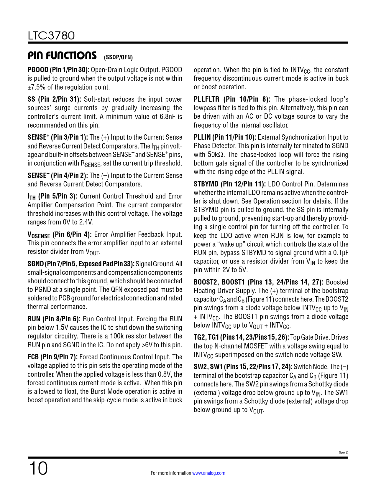 link to page 13 LTC3780 PIN FUNCTIONS (SSOP/QFN) PGOOD (Pin 1/Pin 30): Open-Drain Logic Output. PGOOD operation. When the pin is tied to INTVCC, the constant is pulled to ground when the output voltage is not within frequency discontinuous current mode is active in buck ±7.5% of the regulation point. or boost operation. SS (Pin 2/Pin 31): Soft-start reduces the input power PLLFLTR (Pin 10/Pin 8): The phase-locked loop’s sources’ surge currents by gradually increasing the lowpass filter is tied to this pin. Alternatively, this pin can controller’s current limit. A minimum value of 6.8nF is be driven with an AC or DC voltage source to vary the recommended on this pin. frequency of the internal oscillator. SENSE+ (Pin 3/Pin 1): The (+) Input to the Current Sense PLLIN (Pin 11/Pin 10): External Synchronization Input to and Reverse Current Detect Comparators. The ITH pin volt- Phase Detector. This pin is internally terminated to SGND age and built-in offsets between SENSE– and SENSE+ pins, with 50kΩ. The phase-locked loop will force the rising in conjunction with RSENSE, set the current trip threshold. bottom gate signal of the controller to be synchronized SENSE– (Pin 4/Pin 2): The (–) Input to the Current Sense with the rising edge of the PLLIN signal. and Reverse Current Detect Comparators. STBYMD (Pin 12/Pin 11): LDO Control Pin. Determines I whether the internal LDO remains active when the control- TH (Pin 5/Pin 3): Current Control Threshold and Error Amplifier Compensation Point. The current comparator ler is shut down. See Operation section for details. If the threshold increases with this control voltage. The voltage STBYMD pin is pulled to ground, the SS pin is internally ranges from 0V to 2.4V. pulled to ground, preventing start-up and thereby provid- ing a single control pin for turning off the controller. To VOSENSE (Pin 6/Pin 4): Error Amplifier Feedback Input. keep the LDO active when RUN is low, for example to This pin connects the error amplifier input to an external power a “wake up” circuit which controls the state of the resistor divider from VOUT. RUN pin, bypass STBYMD to signal ground with a 0.1µF SGND (Pin 7/Pin 5, Exposed Pad Pin 33): Signal Ground. All capacitor, or use a resistor divider from VIN to keep the small-signal components and compensation components pin within 2V to 5V. should connect to this ground, which should be connected BOOST2, BOOST1 (Pins 13, 24/Pins 14, 27): Boosted to PGND at a single point. The QFN exposed pad must be Floating Driver Supply. The (+) terminal of the bootstrap soldered to PCB ground for electrical connection and rated capacitor CA and CB (Figure 11) connects here. The BOOST2 thermal performance. pin swings from a diode voltage below INTVCC up to VIN RUN (Pin 8/Pin 6): Run Control Input. Forcing the RUN + INTVCC. The BOOST1 pin swings from a diode voltage pin below 1.5V causes the IC to shut down the switching below INTVCC up to VOUT + INTVCC. regulator circuitry. There is a 100k resistor between the TG2, TG1 (Pins 14, 23/Pins 15, 26): Top Gate Drive. Drives RUN pin and SGND in the IC. Do not apply >6V to this pin. the top N-channel MOSFET with a voltage swing equal to FCB (Pin 9/Pin 7): Forced Continuous Control Input. The INTVCC superimposed on the switch node voltage SW. voltage applied to this pin sets the operating mode of the SW2, SW1 (Pins 15, 22/Pins 17, 24): Switch Node. The (–) controller. When the applied voltage is less than 0.8V, the terminal of the bootstrap capacitor CA and CB (Figure 11) forced continuous current mode is active. When this pin connects here. The SW2 pin swings from a Schottky diode is allowed to float, the Burst Mode operation is active in (external) voltage drop below ground up to VIN. The SW1 boost operation and the skip-cycle mode is active in buck pin swings from a Schottky diode (external) voltage drop below ground up to VOUT. Rev G 10 For more information www.analog.com Document Outline Features Description Applications Typical Application Absolute Maximum Ratings Pin Configuration Order Information Electrical Characteristics Typical Performance Characteristics Block Diagram Operation Applications Information Typical Application Related Parts Features Applications Typical Application Description Absolute Maximum Ratings Pin Configuration Order Information Electrical Characteristics Typical Performance Characteristics Pin Functions Block Diagram Operation Applications Information Package Description Revision History Typical Application Related Parts