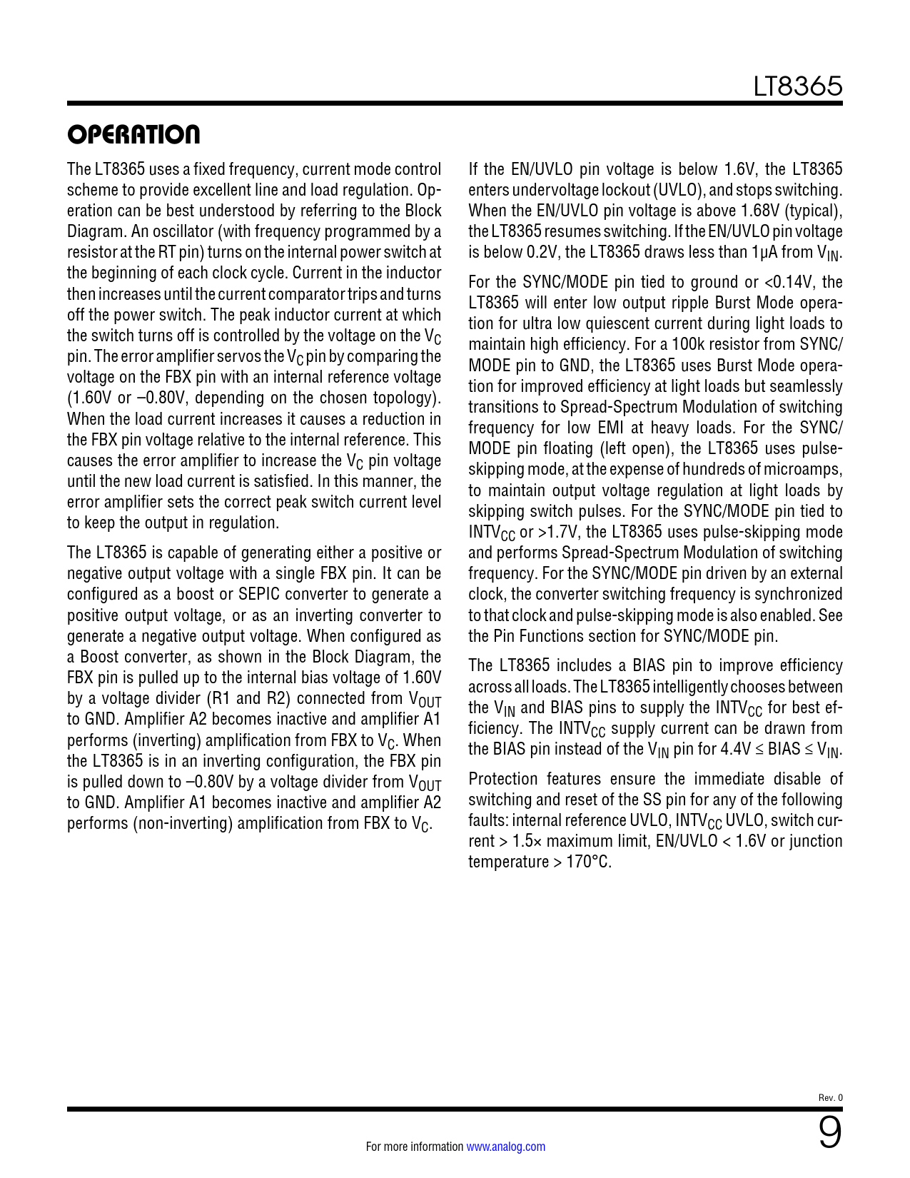 The LT8365 uses a fixed frequency, current mode control If the EN/UVLO pin voltage is below 1.6V, the LT8365 scheme to provide excellent line and load regulation. Op- enters undervoltage lockout (UVLO), and stops switching. eration can be best understood by referring to the Block When the EN/UVLO pin voltage is above 1.68V (typical), Diagram. An oscillator (with frequency programmed by a the LT8365 resumes switching. If the EN/UVLO pin voltage resistor at the RT pin) turns on the internal power switch at is below 0.2V, the LT8365 draws less than 1µA from VIN. the beginning of each clock cycle. Current in the inductor For the SYNC/MODE pin tied to ground or <0.14V, the then increases until the current comparator trips and turns LT8365 will enter low output ripple Burst Mode opera- off the power switch. The peak inductor current at which tion for ultra low quiescent current during light loads to the switch turns off is controlled by the voltage on the VC maintain high efficiency. For a 100k resistor from SYNC/ pin. The error amplifier servos the VC pin by comparing the MODE pin to GND, the LT8365 uses Burst Mode opera- voltage on the FBX pin with an internal reference voltage tion for improved efficiency at light loads but seamlessly (1.60V or –0.80V, depending on the chosen topology). transitions to Spread-Spectrum Modulation of switching When the load current increases it causes a reduction in frequency for low EMI at heavy loads. For the SYNC/ the FBX pin voltage relative to the internal reference. This MODE pin floating (left open), the LT8365 uses pulse- causes the error amplifier to increase the VC pin voltage skipping mode, at the expense of hundreds of microamps, until the new load current is satisfied. In this manner, the to maintain output voltage regulation at light loads by error amplifier sets the correct peak switch current level skipping switch pulses. For the SYNC/MODE pin tied to to keep the output in regulation. INTVCC or >1.7V, the LT8365 uses pulse-skipping mode The LT8365 is capable of generating either a positive or and performs Spread-Spectrum Modulation of switching negative output voltage with a single FBX pin. It can be frequency. For the SYNC/MODE pin driven by an external configured as a boost or SEPIC converter to generate a clock, the converter switching frequency is synchronized positive output voltage, or as an inverting converter to to that clock and pulse-skipping mode is also enabled. See generate a negative output voltage. When configured as the Pin Functions section for SYNC/MODE pin. a Boost converter, as shown in the Block Diagram, the The LT8365 includes a BIAS pin to improve efficiency FBX pin is pulled up to the internal bias voltage of 1.60V across all loads. The LT8365 intelligently chooses between by a voltage divider (R1 and R2) connected from VOUT the V to GND. Amplifier A2 becomes inactive and amplifier A1 IN and BIAS pins to supply the INTVCC for best ef- ficiency. The INTV performs (inverting) amplification from FBX to V CC supply current can be drawn from C. When the BIAS pin instead of the V the LT8365 is in an inverting configuration, the FBX pin IN pin for 4.4V ≤ BIAS ≤ VIN. is pulled down to –0.80V by a voltage divider from VOUT Protection features ensure the immediate disable of to GND. Amplifier A1 becomes inactive and amplifier A2 switching and reset of the SS pin for any of the following performs (non-inverting) amplification from FBX to VC. faults: internal reference UVLO, INTVCC UVLO, switch cur- rent > 1.5× maximum limit, EN/UVLO < 1.6V or junction temperature > 170°C. Rev. 0 For more information www.analog.com 9 Document Outline Features Applications Typical Application Description Absolute Maximum Ratings Order Information Pin Configuration Electrical Characteristics Typical Performance Characteristics Pin Functions Block Diagram Operation Applications Information Typical Applications Package Description Typical Application Related Parts