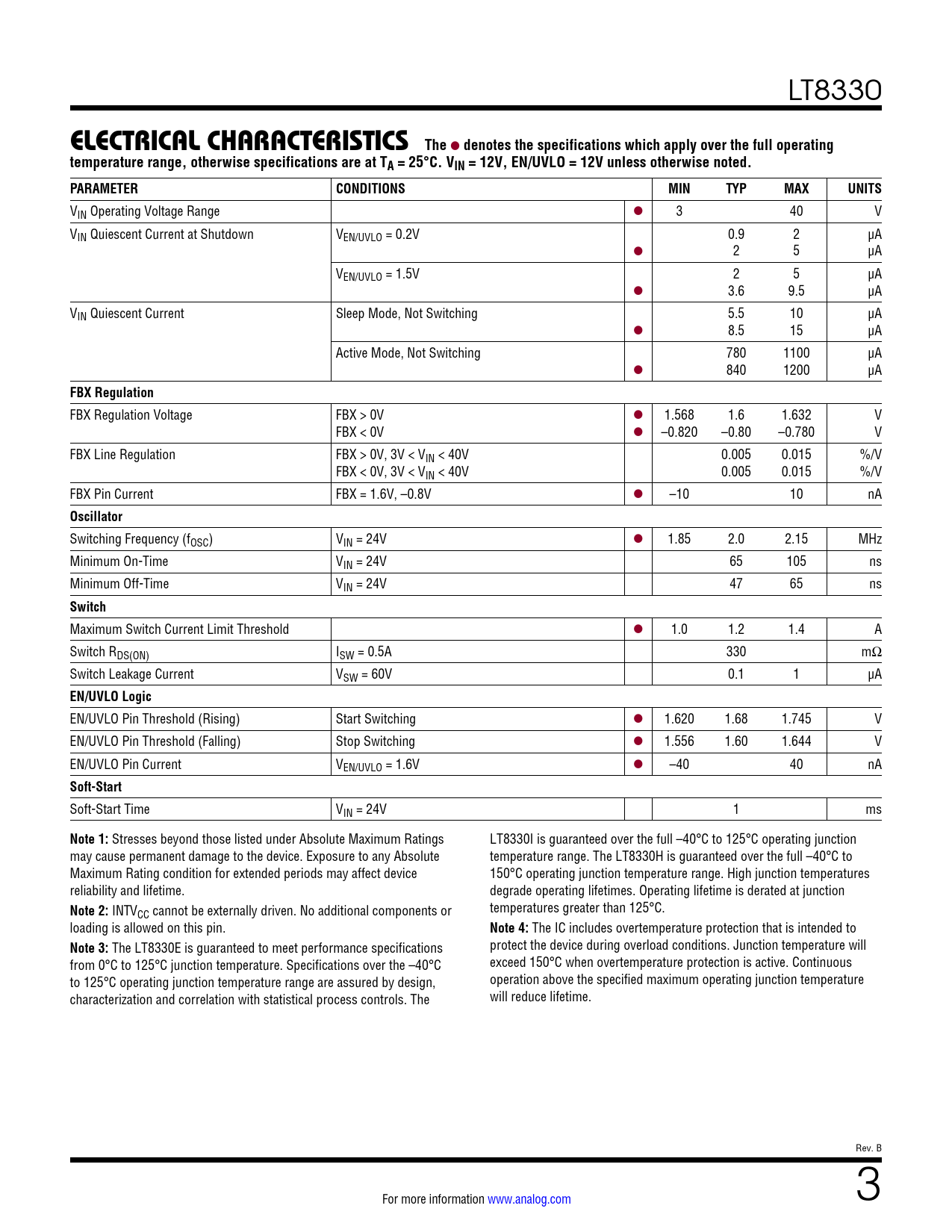 FBX Regulation Voltage FBX > 0V l 1.568 1.6 1.632 V FBX < 0V l –0.820 –0.80 –0.780 V FBX Line Regulation FBX > 0V, 3V < VIN < 40V 0.005 0.015 %/V FBX < 0V, 3V < VIN < 40V 0.005 0.015 %/V FBX Pin Current FBX = 1.6V, –0.8V l –10 10 nA