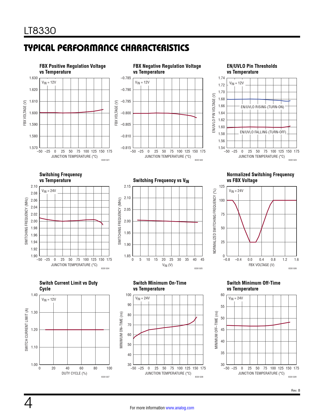 2.10 2.15 125 VIN = 24V V 2.08 IN = 24V 2.10 2.06 100 2.04 2.05 2.02 75 2.00 2.00 1.98 50 1.95 1.96 1.94 SWITCHING FREQUENCY (MHz) SWITCHING FREQUENCY (MHz) 25 1.90 1.92 NORMALIZED SWITCHING FREQUENCY (%) 1.90 1.85 0 –50 –25 0 25 50 75 100 125 150 175 0 5 10 15 20 25 30 35 40 45 –0.8 –0.4 0.0 0.4 0.8 1.2 1.6 JUNCTION TEMPERATURE (°C) VIN (V) FBX VOLTAGE (V) 8330 G04 8330 G05 8330 G06