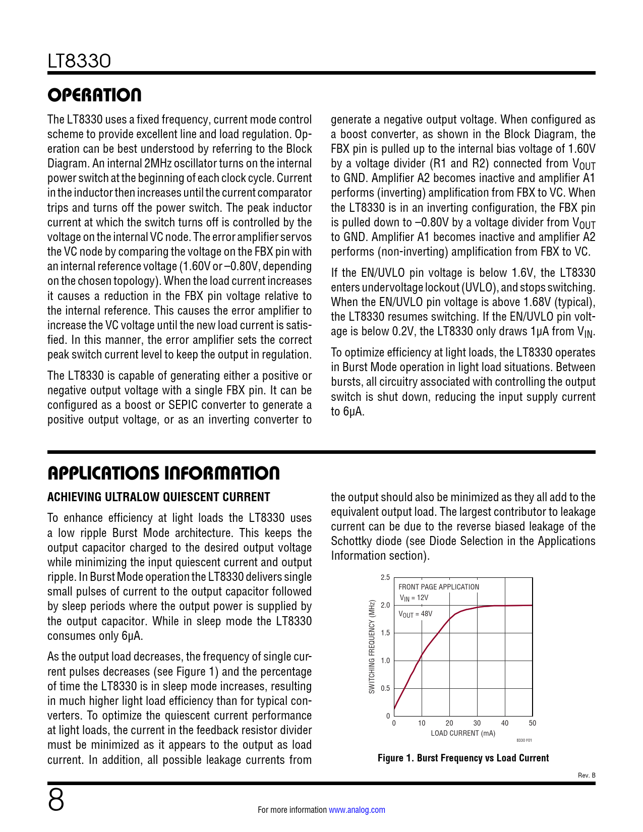 link to page 7 link to page 7 link to page 7 link to page 8 link to page 12 LT8330 OPERATION The LT8330 uses a fixed frequency, current mode control generate a negative output voltage. When configured as scheme to provide excellent line and load regulation. Op- a boost converter, as shown in the Block Diagram, the eration can be best understood by referring to the Block FBX pin is pulled up to the internal bias voltage of 1.60V Diagram. An internal 2MHz oscillator turns on the internal by a voltage divider (R1 and R2) connected from VOUT power switch at the beginning of each clock cycle. Current to GND. Amplifier A2 becomes inactive and amplifier A1 in the inductor then increases until the current comparator performs (inverting) amplification from FBX to VC. When trips and turns off the power switch. The peak inductor the LT8330 is in an inverting configuration, the FBX pin current at which the switch turns off is controlled by the is pulled down to –0.80V by a voltage divider from VOUT voltage on the internal VC node. The error amplifier servos to GND. Amplifier A1 becomes inactive and amplifier A2 the VC node by comparing the voltage on the FBX pin with performs (non-inverting) amplification from FBX to VC. an internal reference voltage (1.60V or –0.80V, depending If the EN/UVLO pin voltage is below 1.6V, the LT8330 on the chosen topology). When the load current increases enters undervoltage lockout (UVLO), and stops switching. it causes a reduction in the FBX pin voltage relative to When the EN/UVLO pin voltage is above 1.68V (typical), the internal reference. This causes the error amplifier to the LT8330 resumes switching. If the EN/UVLO pin volt- increase the VC voltage until the new load current is satis- age is below 0.2V, the LT8330 only draws 1µA from V fied. In this manner, the error amplifier sets the correct IN. peak switch current level to keep the output in regulation. To optimize efficiency at light loads, the LT8330 operates in Burst Mode operation in light load situations. Between The LT8330 is capable of generating either a positive or bursts, all circuitry associated with controlling the output negative output voltage with a single FBX pin. It can be switch is shut down, reducing the input supply current configured as a boost or SEPIC converter to generate a to 6µA. positive output voltage, or as an inverting converter to APPLICATIONS INFORMATION ACHIEVING ULTRALOW QUIESCENT CURRENT the output should also be minimized as they all add to the To enhance efficiency at light loads the LT8330 uses equivalent output load. The largest contributor to leakage a low ripple Burst Mode architecture. This keeps the current can be due to the reverse biased leakage of the output capacitor charged to the desired output voltage Schottky diode (see Diode Selection in the Applications while minimizing the input quiescent current and output Information section). ripple. In Burst Mode operation the LT8330 delivers single 2.5 small pulses of current to the output capacitor followed FRONT PAGE APPLICATION V by sleep periods where the output power is supplied by IN = 12V 2.0 the output capacitor. While in sleep mode the LT8330 VOUT = 48V consumes only 6µA. 1.5 As the output load decreases, the frequency of single cur- 1.0 rent pulses decreases (see Figure 1) and the percentage of time the LT8330 is in sleep mode increases, resulting 0.5 SWITCHING FREQUENCY (MHz) in much higher light load efficiency than for typical con- verters. To optimize the quiescent current performance 0 at light loads, the current in the feedback resistor divider 0 10 20 30 40 50 LOAD CURRENT (mA) must be minimized as it appears to the output as load 8330 F01 current. In addition, all possible leakage currents from Figure 1. Burst Frequency vs Load Current Rev. B 8 For more information www.analog.com Document Outline Features Applications Typical Application Description Absolute Maximum Ratings Pin Configuration Order Information Electrical Characteristics Typical Performance Characteristics Pin Functions Block Diagram Operation Applications Information Typical Applications Package Description Revision History Typical Application Related Parts