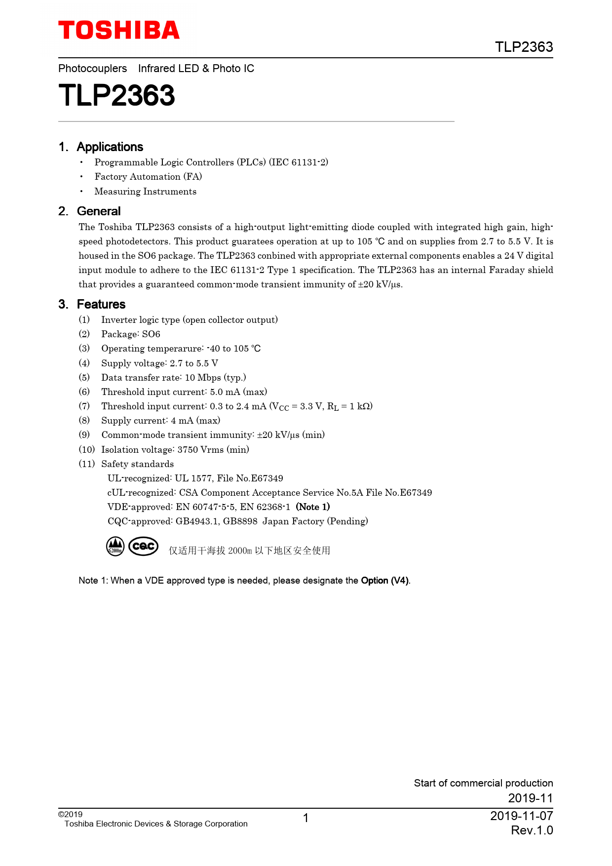TLP2363. Photocouplers. Infrared. LED. &. Photo. IC. TLP2363. 1. Applications. •. Programmable. Logic. Controllers. (PLCs). (IEC. 61131-2). •. Factory