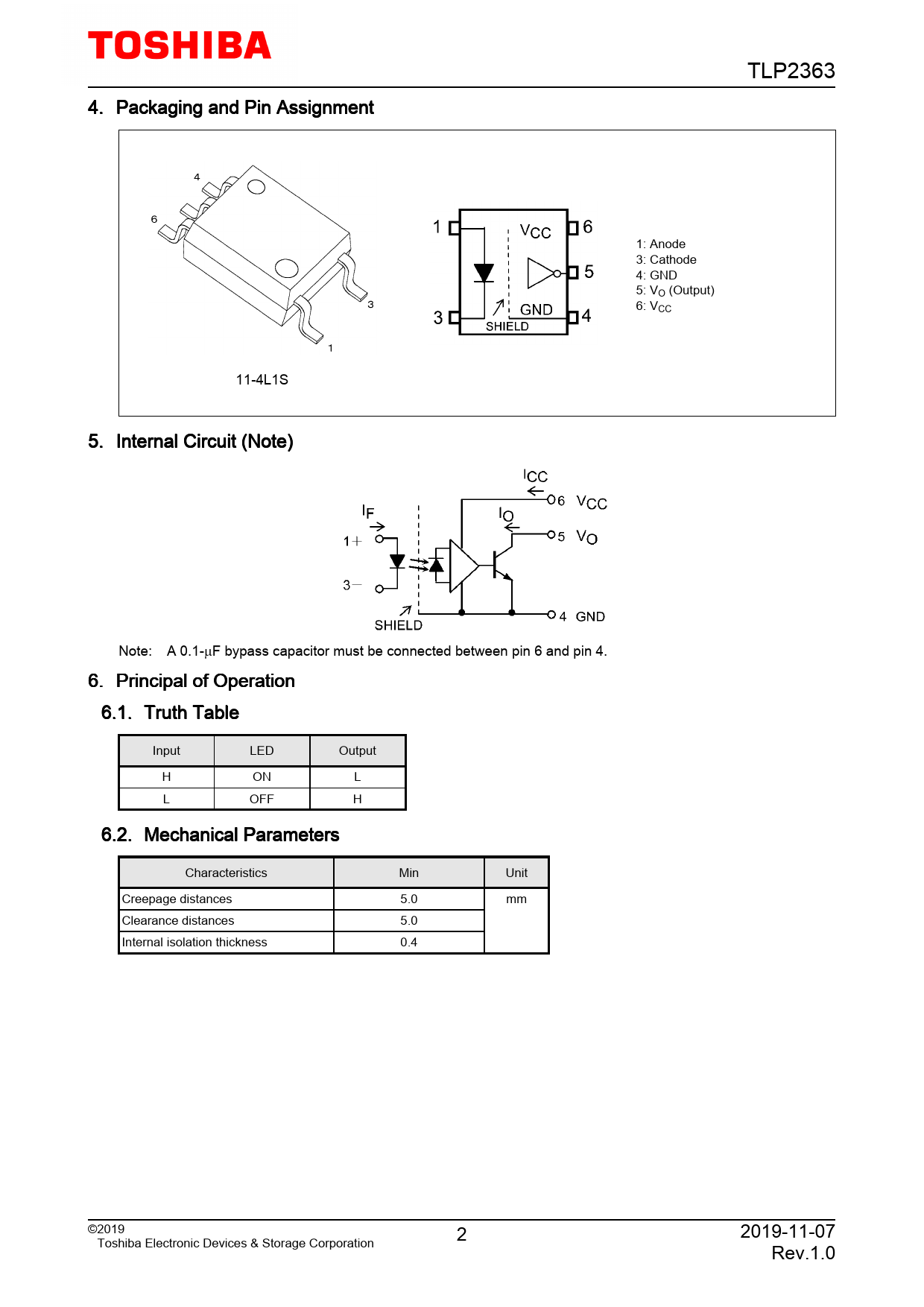 TLP2363. 4. Packaging. and. Pin. Assignment. 1:. Anode. 3:. Cathode. 4:. GND. 5:. VO. (Output). 6:. VCC. 11-4L1S. 5. Internal. Circuit. (Note). Note:. A. 0.1-µF. bypass