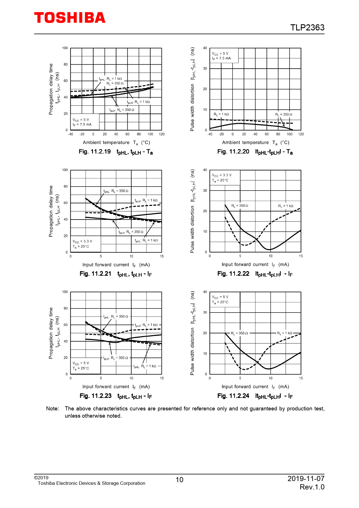 TLP2363 Fig. 11.2.19 tpHL, tpLH - Ta Fig. 11.2.20 ltpHL-tpLHl - Ta Fig. 11.2.21 tpHL, tpLH - IF Fig. 11.2.22 ltpHL-tpLHl - IF Fig. 11.2.23 tpHL, tpLH - IF Fig. 11.2.24 ltpHL-tpLHl - IF Note: The above characteristics curves are presented for reference only and not guaranteed by production test, unless otherwise noted. ©2019 10 2019-11-07 Toshiba Electronic Devices & Storage Corporation Rev.1.0
