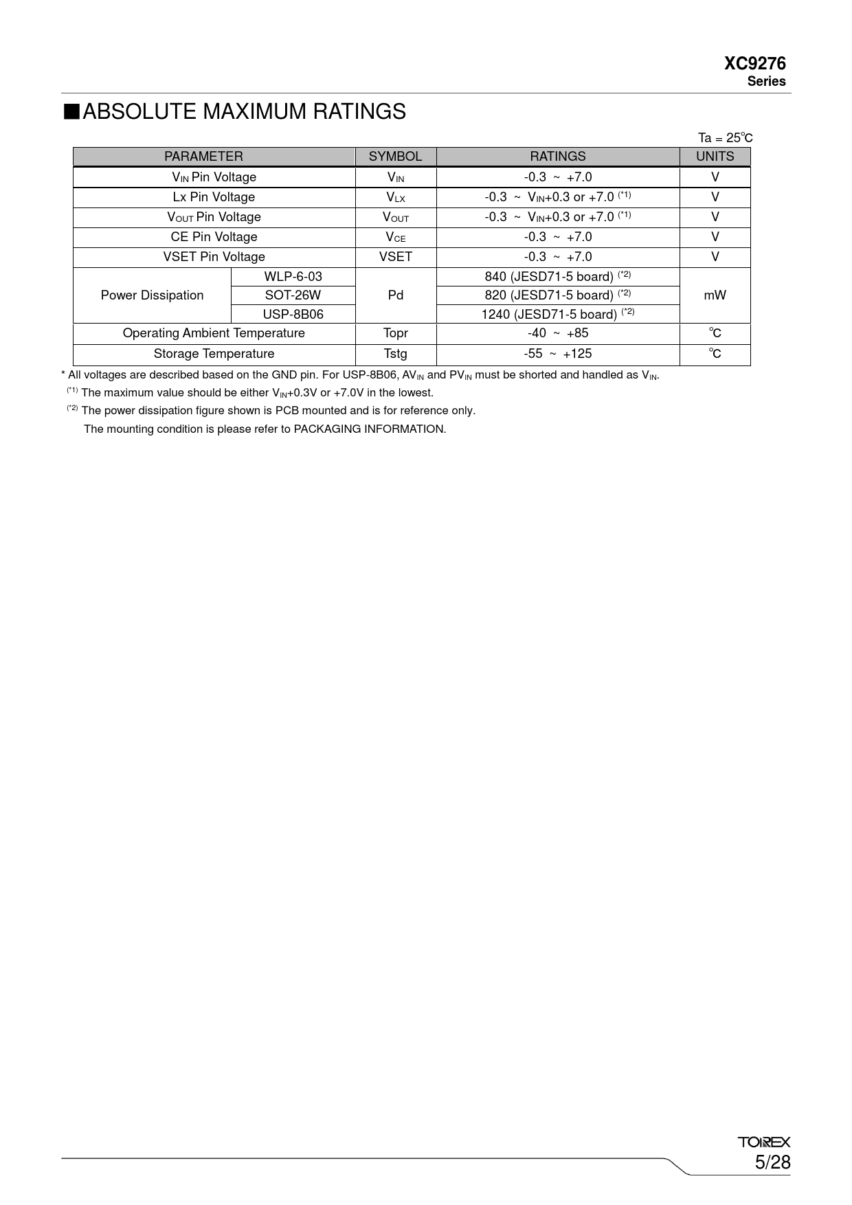 ■ABSOLUTE MAXIMUM RATINGS Ta = 25℃ PARAMETER SYMBOL RATINGS UNITS VIN Pin Voltage VIN -0.3 ~ +7.0 V Lx Pin Voltage VLX -0.3 ~ VIN+0.3 or +7.0 (*1) V VOUT Pin Voltage VOUT -0.3 ~ VIN+0.3 or +7.0 (*1) V CE Pin Voltage VCE -0.3 ~ +7.0 V VSET Pin Voltage VSET -0.3 ~ +7.0 V WLP-6-03 840 (JESD71-5 board) (*2) Power Dissipation SOT-26W Pd 820 (JESD71-5 board) (*2) mW USP-8B06 1240 (JESD71-5 board) (*2) Operating Ambient Temperature Topr -40 ~ +85 ℃ Storage Temperature Tstg -55 ~ +125 ℃ * All voltages are described based on the GND pin. For USP-8B06, AVIN and PVIN must be shorted and handled as VIN. (*1) The maximum value should be either VIN+0.3V or +7.0V in the lowest. (*2) The power dissipation figure shown is PCB mounted and is for reference only. The mounting condition is please refer to PACKAGING INFORMATION. 5/28 Document Outline GRM188R61A106ME69 LMK107BBJ106MALT GRM188R61A106ME69 GRM188R60J226MEA0 GRM188R61A226ME15 GRM188R60J476ME15 LMK107BBJ106MALT JMK107BBJ226MA C1608X5R0J226M080AC