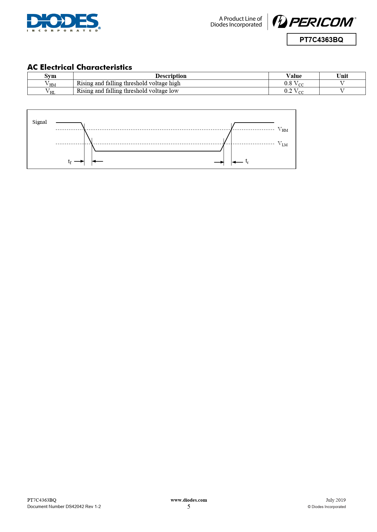 VHM Rising and falling threshold voltage high 0.8 VCC V VHL Rising and falling threshold voltage low 0.2 VCC V Signal VHM VLM tf tr PT7C4363BQ
