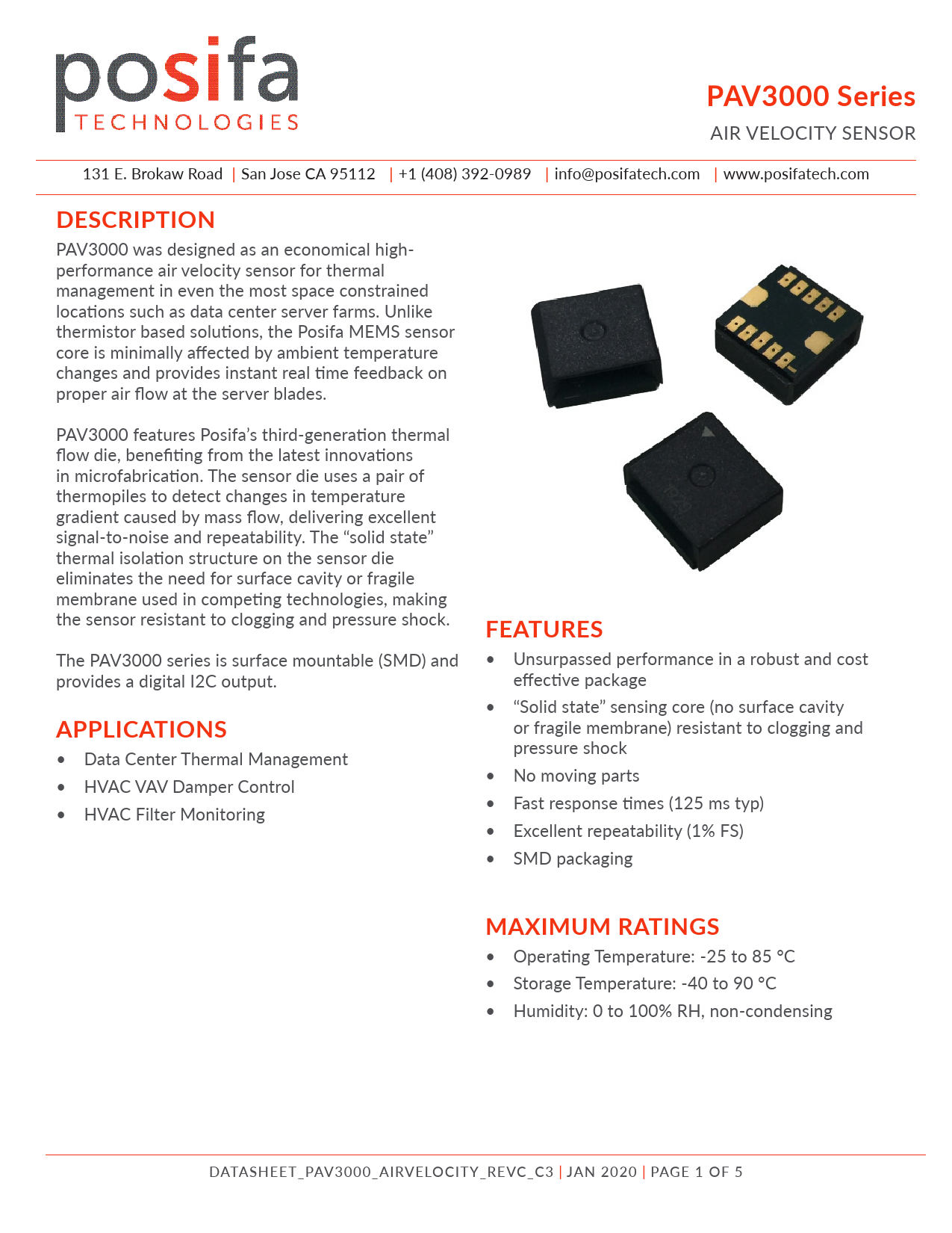 PAV3000 Series AIR VELOCITY SENSOR 131 E. Brokaw Road | San Jose CA 95112 | +1 (408) 392-0989 | info@posifatech.com | www.posifatech.com DESCRIPTION PAV3000 was designed as an economical high- performance air velocity sensor for thermal management in even the most space constrained locations such as data center server farms. Unlike thermistor based solutions, the Posifa MEMS sensor core is minimally affected by ambient temperature changes and provides instant real time feedback on proper air flow at the server blades. PAV3000 features Posifa’s third-generation thermal flow die, benefiting from the latest innovations in microfabrication. The sensor die uses a pair of thermopiles to detect changes in temperature gradient caused by mass flow, delivering excellent signal-to-noise and repeatability. The “solid state” thermal isolation structure on the sensor die eliminates the need for surface cavity or fragile membrane used in competing technologies, making the sensor resistant to clogging and pressure shock. FEATURES The PAV3000 series is surface mountable (SMD) and • Unsurpassed performance in a robust and cost provides a digital I2C output. effective package • “Solid state” sensing core (no surface cavity APPLICATIONS or fragile membrane) resistant to clogging and • Data Center Thermal Management pressure shock • HVAC VAV Damper Control • No moving parts • HVAC Filter Monitoring • Fast response times (125 ms typ) • Excellent repeatability (1% FS) • SMD packaging MAXIMUM RATINGS • Operating Temperature: -25 to 85 °C • Storage Temperature: -40 to 90 °C • Humidity: 0 to 100% RH, non-condensing Datasheet_PaV3000_airVelocity_reVc_c3 | Jan 2020 | PaGe 1 oF 5