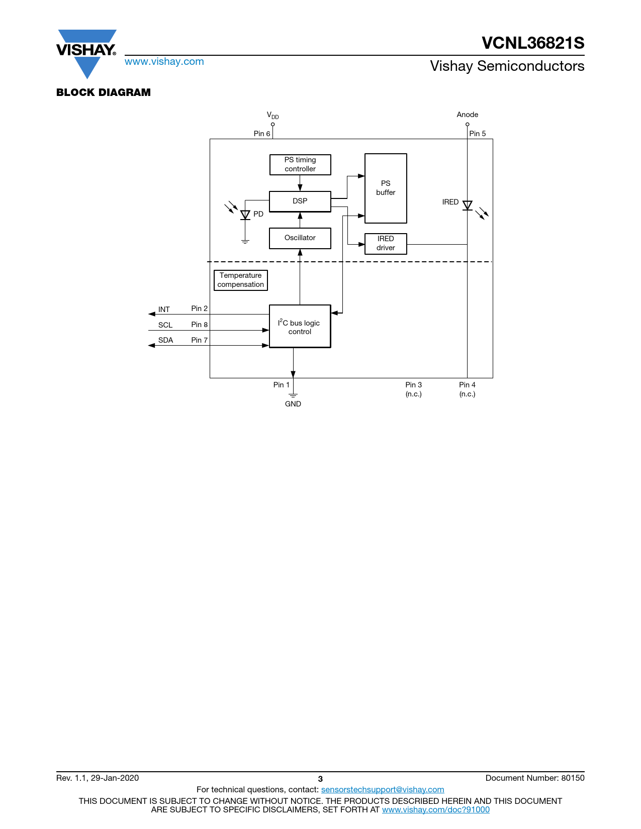 V Anode DD Pin 6 Pin 5 PS timing controller PS buffer DSP IRED PD Oscillator IRED driver Temperature compensation INT Pin 2 SCL I2C bus logic Pin 8 control SDA Pin 7 Pin 1 Pin 3 Pin 4 (n.c.) (n.c.) GND Rev. 1.1, 29-Jan-2020