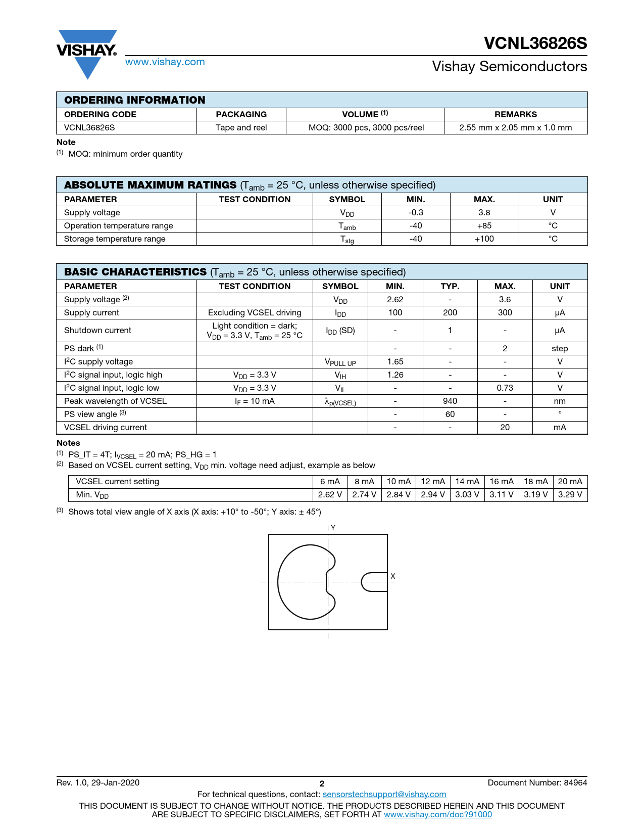 VCNL36826S www.vishay.com Vishay Semiconductors ORDERING INFORMATION ORDERING CODEPACKAGINGVOLUME (1)REMARKS VCNL36826S Tape and reel MOQ: 3000 pcs, 3000 pcs/reel 2.55 mm x 2.05 mm x 1.0 mm Note (1) MOQ: minimum order quantity ABSOLUTE MAXIMUM RATINGS (Tamb = 25 °C, unless otherwise specified) PARAMETERTEST CONDITIONSYMBOLMIN.MAX.UNIT Supply voltage VDD -0.3 3.8 V Operation temperature range Tamb -40 +85 °C Storage temperature range Tstg -40 +100 °C BASIC CHARACTERISTICS (Tamb = 25 °C, unless otherwise specified) PARAMETERTEST CONDITIONSYMBOLMIN.TYP.MAX.UNIT Supply voltage (2) VDD 2.62 - 3.6 V Supply current Excluding VCSEL driving IDD 100 200 300 μA Light condition = dark; Shutdown current I V DD (SD) - 1 - μA DD = 3.3 V, Tamb = 25 °C PS dark (1) - - 2 step I2C supply voltage VPULL UP 1.65 - - V I2C signal input, logic high VDD = 3.3 V VIH 1.26 - - V I2C signal input, logic low VDD = 3.3 V VIL - - 0.73 V Peak wavelength of VCSEL IF = 10 mA λp(VCSEL) - 940 - nm PS view angle (3) - 60 - ° VCSEL driving current - - 20 mA Notes (1) PS_IT = 4T; IVCSEL = 20 mA; PS_HG = 1 (2) Based on VCSEL current setting, VDD min. voltage need adjust, example as below VCSEL current setting 6 mA 8 mA 10 mA 12 mA 14 mA 16 mA 18 mA 20 mA Min. VDD 2.62 V 2.74 V 2.84 V 2.94 V 3.03 V 3.11 V 3.19 V 3.29 V (3) Shows total view angle of X axis (X axis: +10° to -50°; Y axis: ± 45°) Y X Rev. 1.0, 29-Jan-2020 2 Document Number: 84964 For technical questions, contact: sensorstechsupport@vishay.com THIS DOCUMENT IS SUBJECT TO CHANGE WITHOUT NOTICE. THE PRODUCTS DESCRIBED HEREIN AND THIS DOCUMENT ARE SUBJECT TO SPECIFIC DISCLAIMERS, SET FORTH AT www.vishay.com/doc?91000