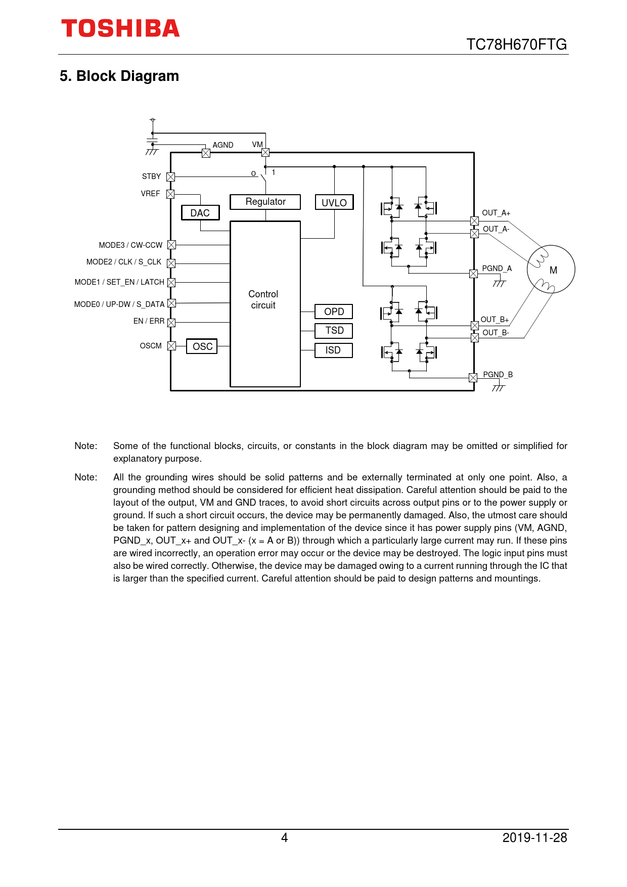 TC78H670FTG 5. Block Diagram AGND VM 0 1 STBY VREF Regulator UVLO DAC OUT_A+ OUT_A- MODE3 / CW-CCW MODE2 / CLK / S_CLK PGND_A M MODE1 / SET_EN / LATCH Control MODE0 / UP-DW / S_DATA circuit OPD EN / ERR OUT_B+ TSD OUT_B- OSCM OSC ISD PGND_B Note: Some of the functional blocks, circuits, or constants in the block diagram may be omitted or simplified for explanatory purpose. Note: All the grounding wires should be solid patterns and be externally terminated at only one point. Also, a grounding method should be considered for efficient heat dissipation. Careful attention should be paid to the layout of the output, VM and GND traces, to avoid short circuits across output pins or to the power supply or ground. If such a short circuit occurs, the device may be permanently damaged. Also, the utmost care should be taken for pattern designing and implementation of the device since it has power supply pins (VM, AGND, PGND_x, OUT_x+ and OUT_x- (x = A or B)) through which a particularly large current may run. If these pins are wired incorrectly, an operation error may occur or the device may be destroyed. The logic input pins must also be wired correctly. Otherwise, the device may be damaged owing to a current running through the IC that is larger than the specified current. Careful attention should be paid to design patterns and mountings. 4 2019-11-28