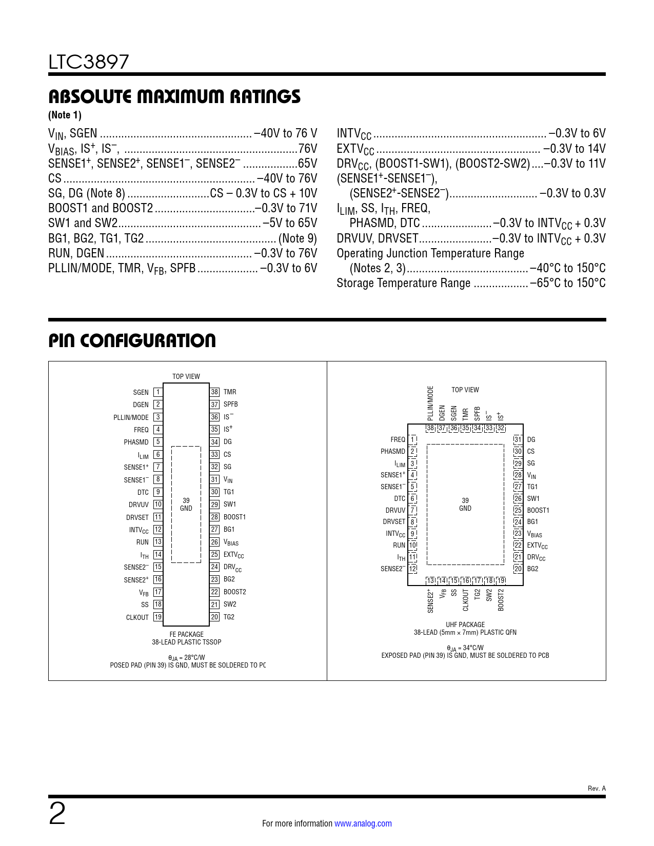 VIN, SGEN .. –40V to 76 V INTVCC ... –0.3V to 6V VBIAS, IS+, IS–, ...76V EXTVCC .. –0.3V to 14V SENSE1+, SENSE2+, SENSE1–, SENSE2– ..65V DRVCC, (BOOST1-SW1), (BOOST2-SW2) ..–0.3V to 11V CS ... –40V to 76V (SENSE1+-SENSE1–), SG, DG (Note 8) ...CS – 0.3V to CS + 10V (SENSE2+-SENSE2–) ... –0.3V to 0.3V BOOST1 and BOOST2 ...–0.3V to 71V ILIM, SS, ITH, FREQ, SW1 and SW2 ... –5V to 65V PHASMD, DTC ...–0.3V to INTVCC + 0.3V BG1, BG2, TG1, TG2 ... (Note 9) DRVUV, DRVSET ..–0.3V to INTVCC + 0.3V RUN, DGEN .. –0.3V to 76V Operating Junction Temperature Range PLLIN/MODE, TMR, VFB, SPFB .. –0.3V to 6V (Notes 2, 3) .. –40°C to 150°C Storage Temperature Range .. –65°C to 150°C