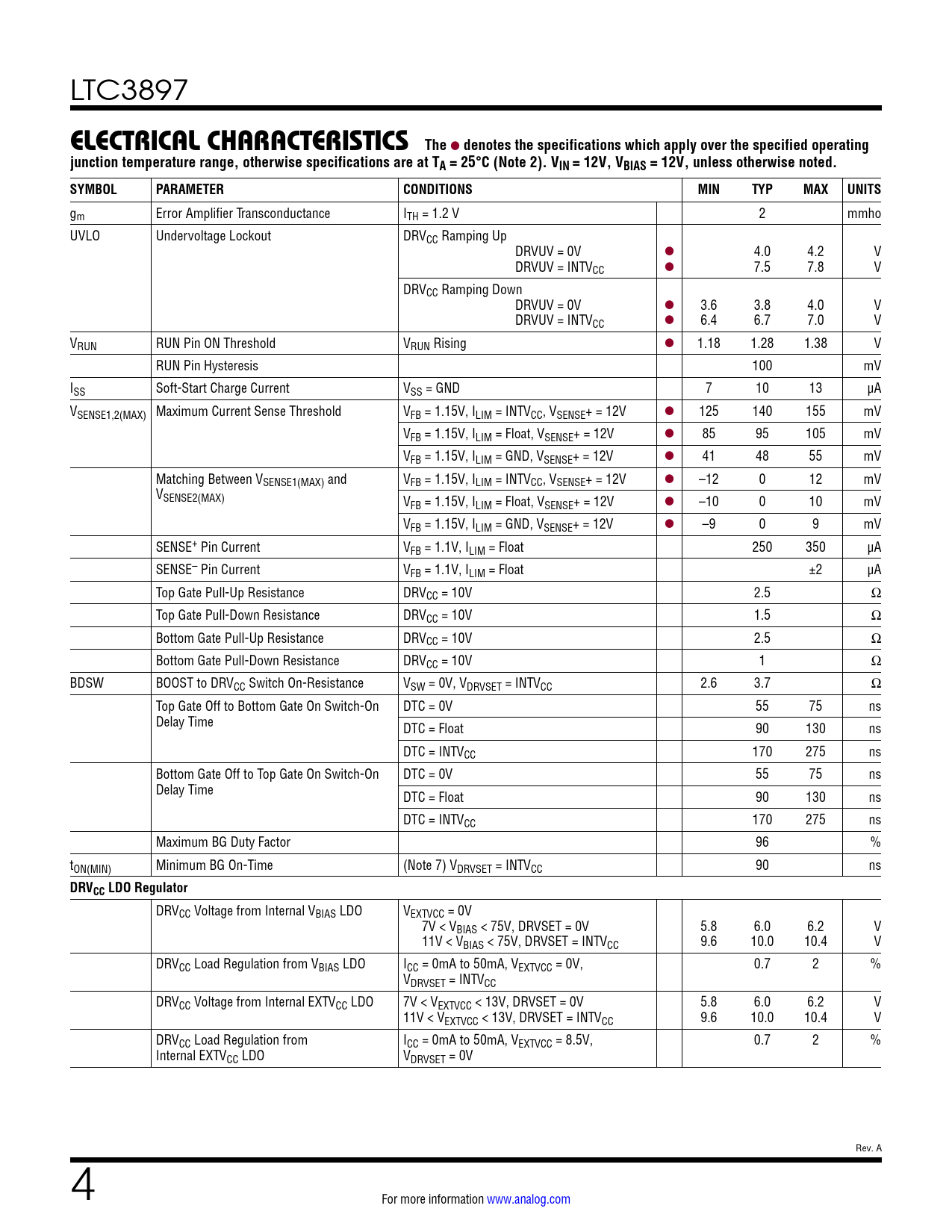 gm Error Amplifier Transconductance ITH = 1.2 V 2 mmho UVLO Undervoltage Lockout DRVCC Ramping Up DRVUV = 0V l 4.0 4.2 V DRVUV = INTVCC l 7.5 7.8 V DRVCC Ramping Down DRVUV = 0V l 3.6 3.8 4.0 V DRVUV = INTVCC l 6.4 6.7 7.0 V VRUN RUN Pin ON Threshold VRUN Rising l 1.18 1.28 1.38 V RUN Pin Hysteresis 100 mV ISS Soft-Start Charge Current VSS = GND 7 10 13 µA VSENSE1,2(MAX) Maximum Current Sense Threshold VFB = 1.15V, ILIM = INTVCC, VSENSE+ = 12V l 125 140 155 mV VFB = 1.15V, ILIM = Float, VSENSE+ = 12V l 85 95 105 mV VFB = 1.15V, ILIM = GND, VSENSE+ = 12V l 41 48 55 mV Matching Between VSENSE1(MAX) and VFB = 1.15V, ILIM = INTVCC, VSENSE+ = 12V l –12 0 12 mV VSENSE2(MAX) VFB = 1.15V, ILIM = Float, VSENSE+ = 12V l –10 0 10 mV VFB = 1.15V, ILIM = GND, VSENSE+ = 12V l –9 0 9 mV SENSE+ Pin Current VFB = 1.1V, ILIM = Float 250 350 µA SENSE– Pin Current VFB = 1.1V, ILIM = Float ±2 µA Top Gate Pull-Up Resistance DRVCC = 10V 2.5 Ω Top Gate Pull-Down Resistance DRVCC = 10V 1.5 Ω Bottom Gate Pull-Up Resistance DRVCC = 10V 2.5 Ω Bottom Gate Pull-Down Resistance DRVCC = 10V 1 Ω BDSW BOOST to DRVCC Switch On-Resistance VSW = 0V, VDRVSET = INTVCC 2.6 3.7 Ω Top Gate Off to Bottom Gate On Switch-On DTC = 0V 55 75 ns Delay Time DTC = Float 90 130 ns DTC = INTVCC 170 275 ns Bottom Gate Off to Top Gate On Switch-On DTC = 0V 55 75 ns Delay Time DTC = Float 90 130 ns DTC = INTVCC 170 275 ns Maximum BG Duty Factor 96 % tON(MIN) Minimum BG On-Time (Note 7) VDRVSET = INTVCC 90 ns
