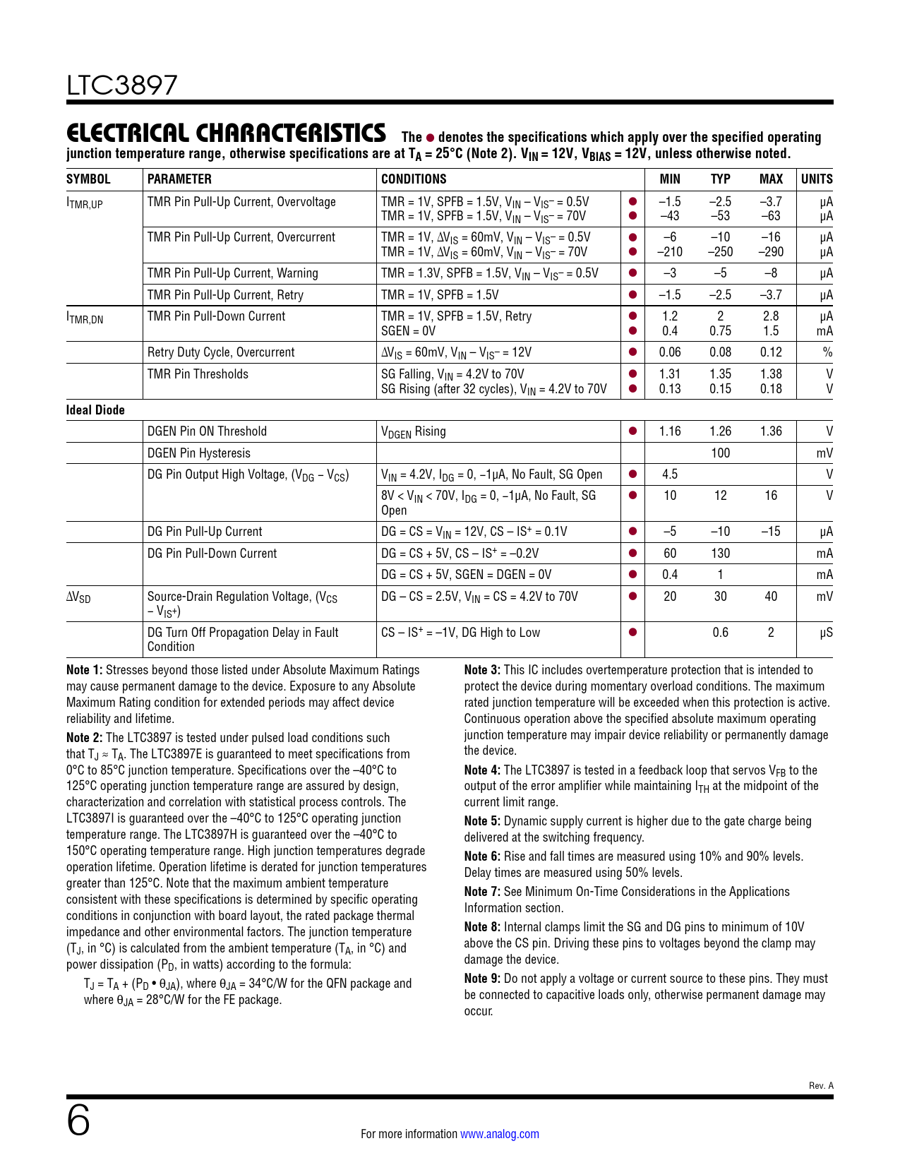 The LTC3897 is tested under pulsed load conditions such junction temperature may impair device reliability or permanently damage that T the device. J ≈ TA. The LTC3897E is guaranteed to meet specifications from 0°C to 85°C junction temperature. Specifications over the –40°C to