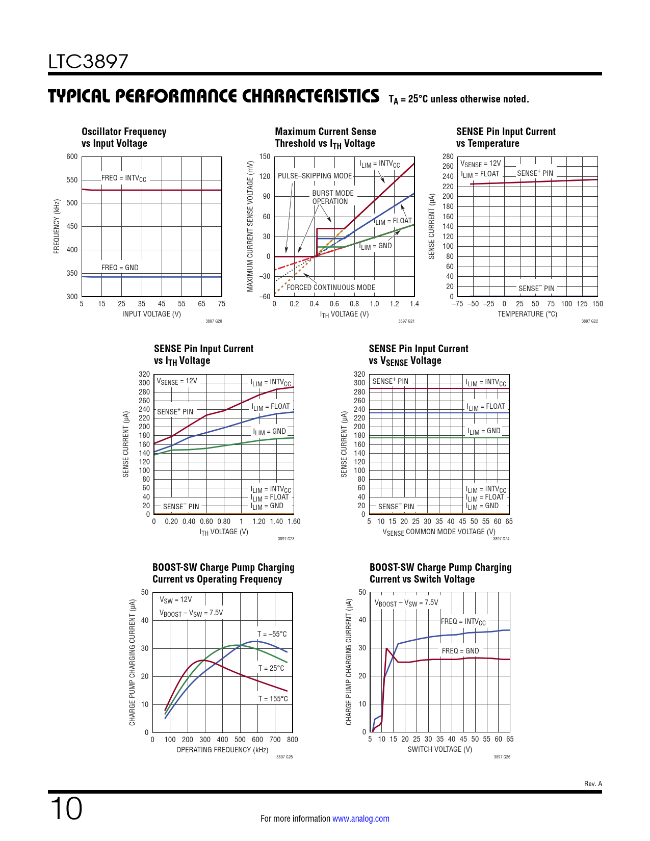 320 320 V 300 SENSE = 12V ILIM = INTVCC 300 SENSE+ PIN ILIM = INTVCC 280 280 260 260 I 240 I SENSE+ PIN LIM = FLOAT 240 LIM = FLOAT 220 220 200 I 200 LIM = GND I 180 LIM = GND 180 160 160 140 140 120 120 100 SENSE CURRENT (µA) 100 80 SENSE CURRENT (µA) 80 60 ILIM = INTVCC 60 ILIM = INTVCC 40 ILIM = FLOAT 40 ILIM = FLOAT 20 SENSE– PIN ILIM = GND 20 SENSE– PIN ILIM = GND 0 0 0 0.20 0.40 0.60 0.80 1 1.20 1.40 1.60 5 10 15 20 25 30 35 40 45 50 55 60 65 ITH VOLTAGE (V) VSENSE COMMON MODE VOLTAGE (V) 3897 G23 3897 G24