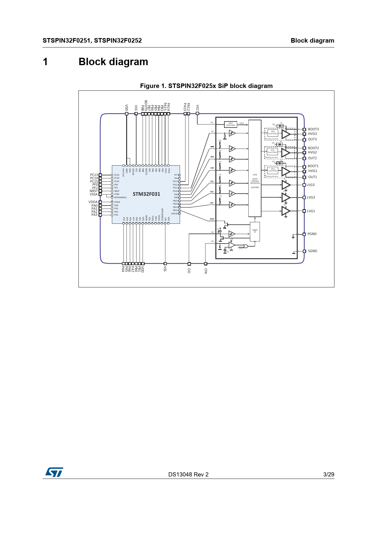 | Pages / Page | 29 / 3 — STSPIN32F0251, STSPIN32F0252. Block diagram. Figure 1. STSPIN32F025x SiP … |