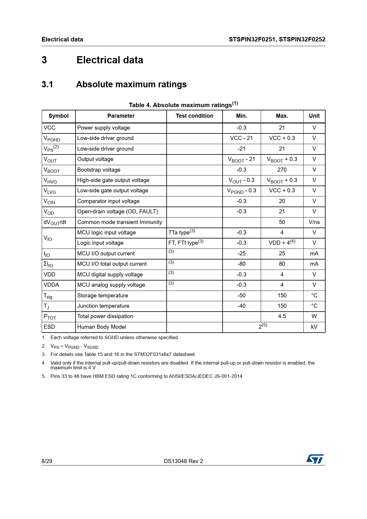 Electrical data. STSPIN32F0251, STSPIN32F0252. 3.1. Absolute maximum ratings. Table 4. Absolute maximum ratings(1). Symbol
