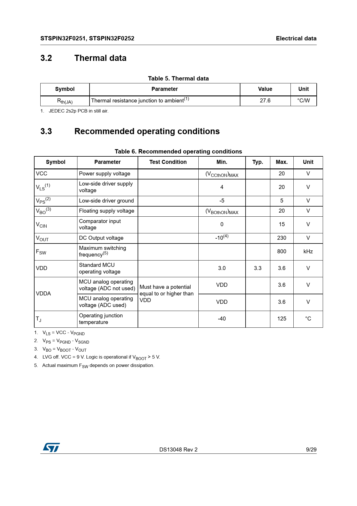Pages / Page29 / 9 — STSPIN32F0251, STSPIN32F0252. Electrical data. 3.2. Thermal data. Table …