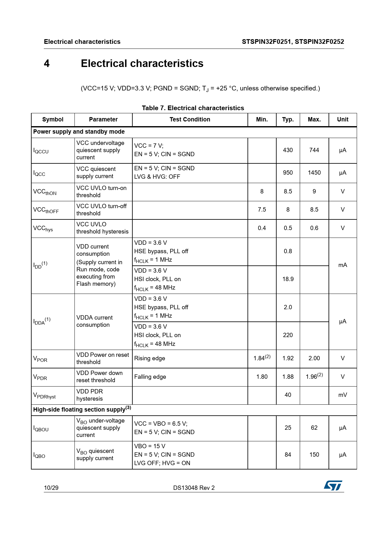 | Pages / Page | 29 / 10 — Electrical characteristics. STSPIN32F0251, STSPIN32F0252. Table 7. … |