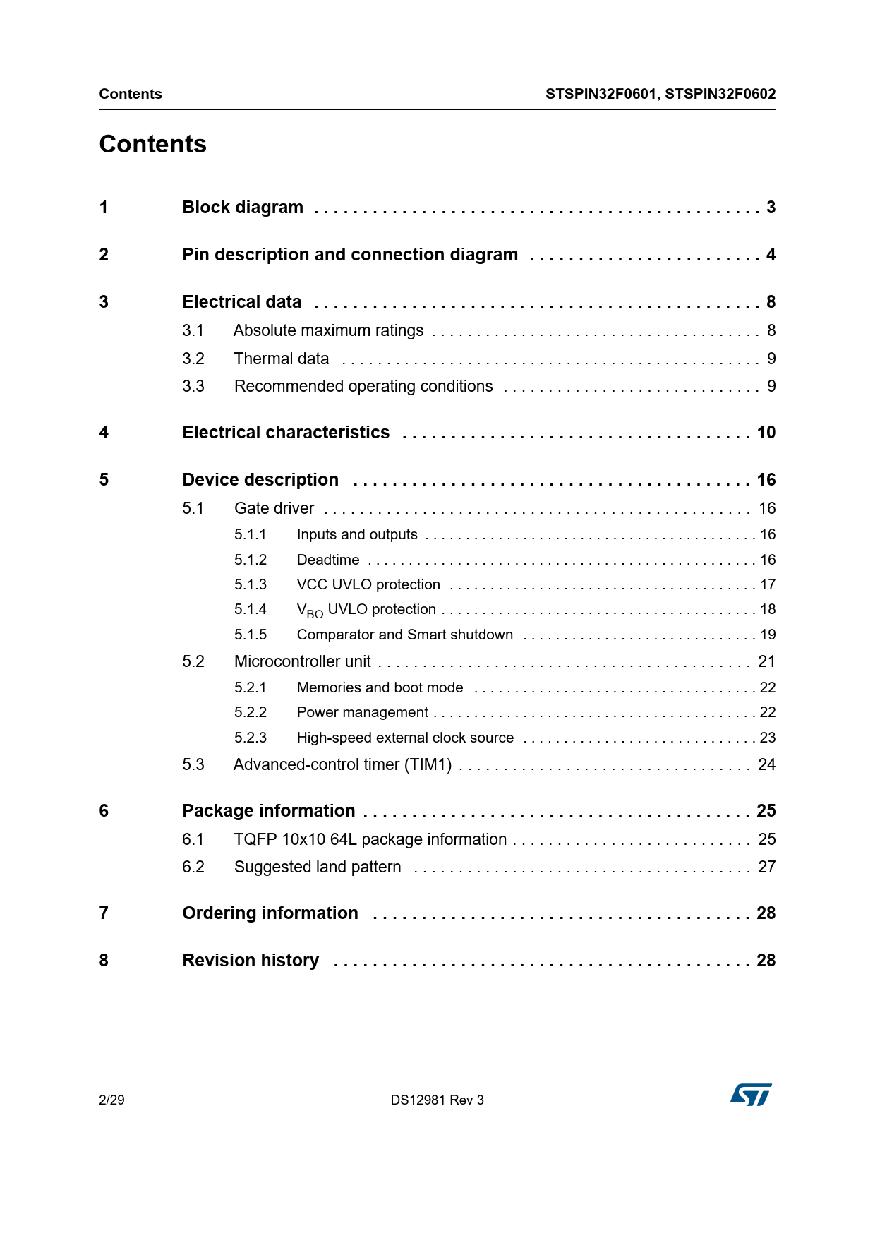 | Pages / Page | 29 / 2 — Contents STSPIN32F0601, STSPIN32F0602 Contents |