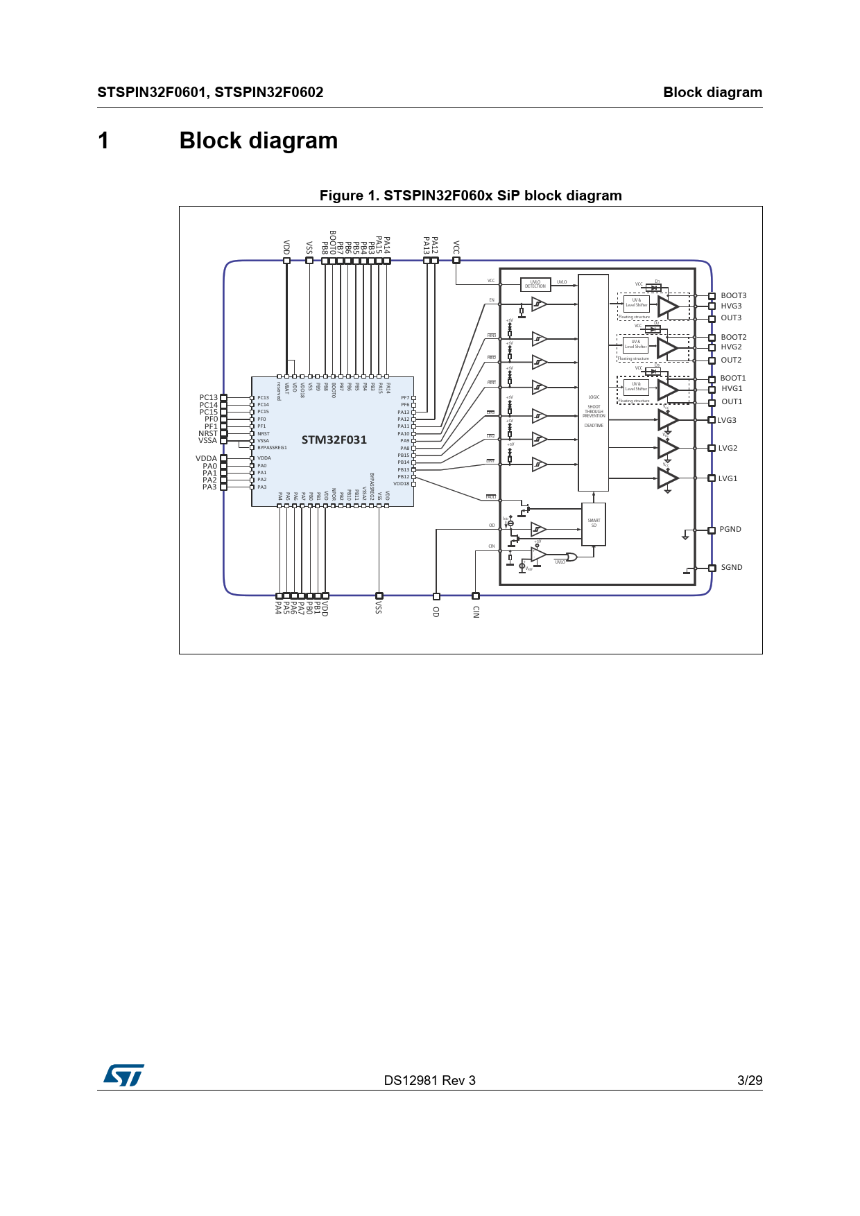 | Pages / Page | 29 / 3 — STSPIN32F0601, STSPIN32F0602. Block diagram. Figure 1. STSPIN32F060x SiP … |