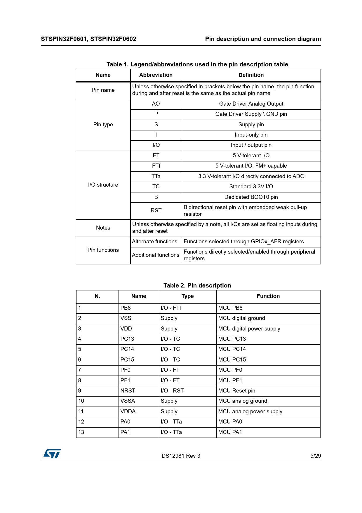 STSPIN32F0601, STSPIN32F0602 Pin description and connection diagram Table 1. Legend/abbreviations used in the pin description table Name Abbreviation Definition