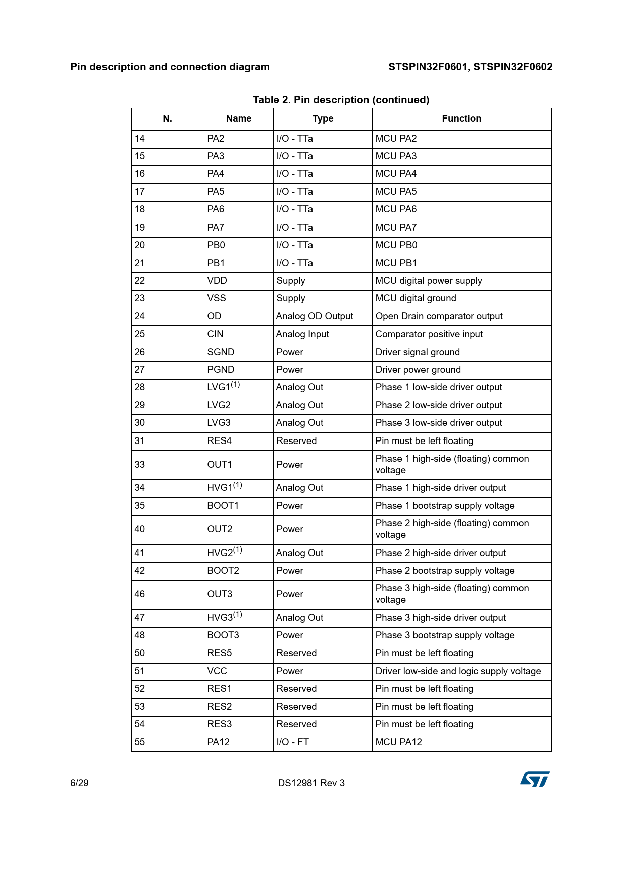 Pin description and connection diagram. STSPIN32F0601, STSPIN32F0602. Table 2. Pin description (continued). Name. Type. Function