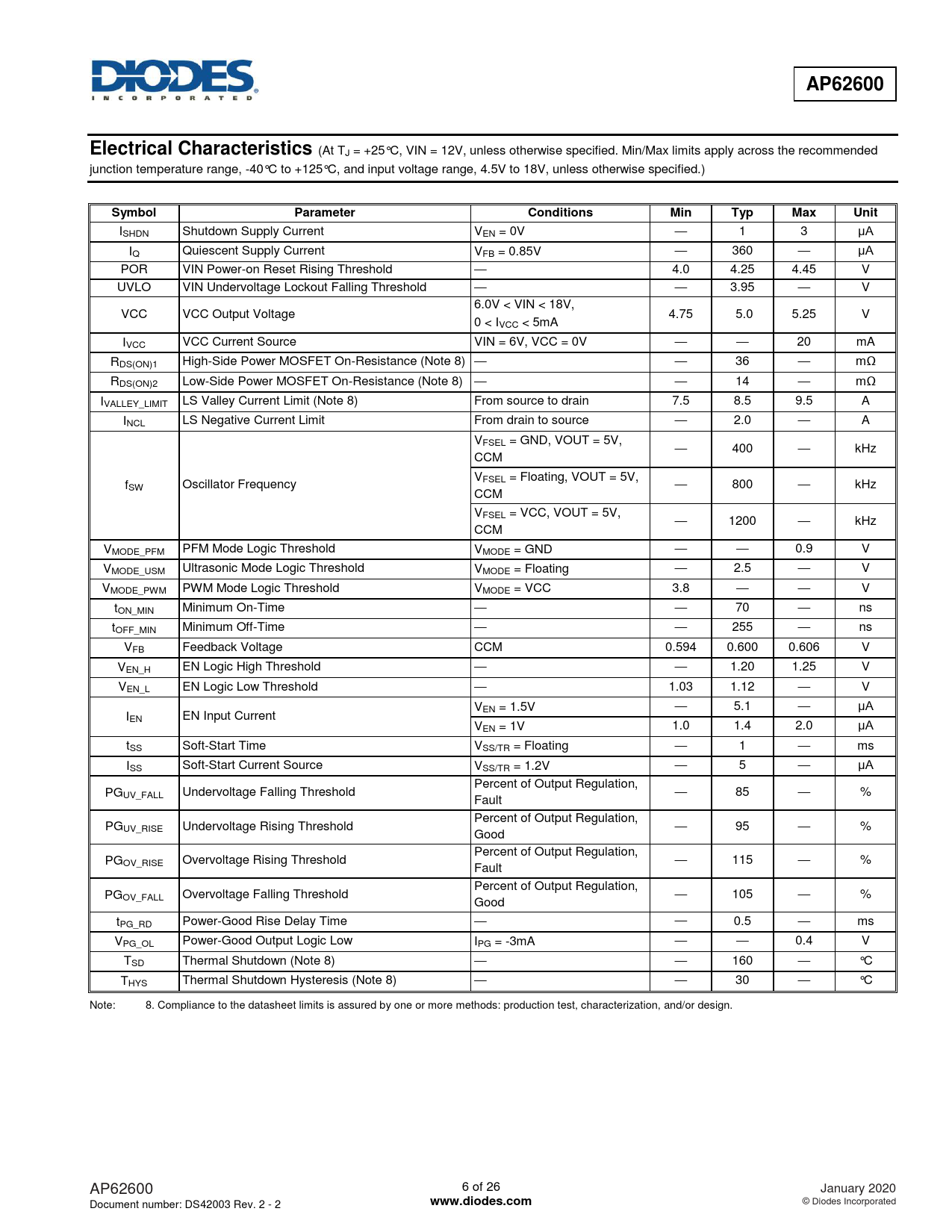 AP62600. Electrical Characteristics. Symbol. Parameter. Conditions. Min. Typ. Max. Unit. www.diodes.com