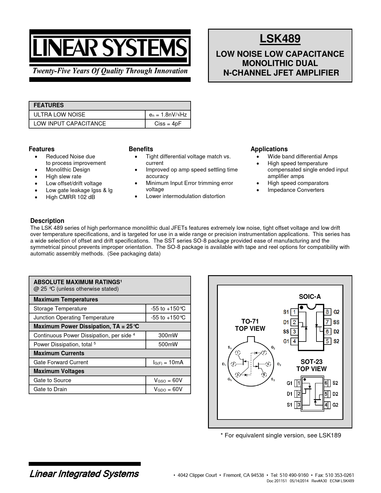 Gate to Source V • GSO = 60V Gate to Drain VGDO = 60V * For equivalent single version, see LSK189 Linear Integrated Systems • 4042 Clipper Court • Fremont, CA 94538 • Tel: 510 490-9160 • Fax: 510 353-0261 Doc 201151 05/14/2014 Rev#A30 ECN# LSK489